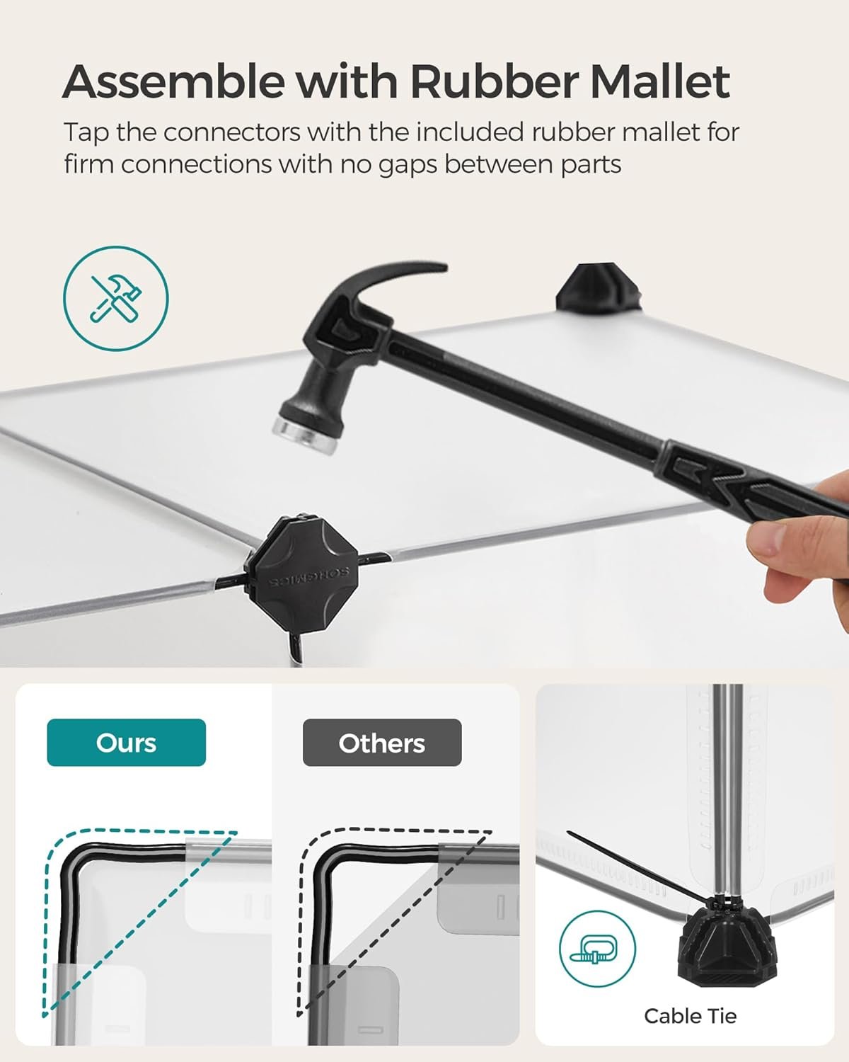 To prevent pets from chewing or biting, install the plastic panels with the sides featuring the seams facing downwards or outwards.To prevent pet droppings or debris from leaking and soiling the floor, we recommend placing a pee mat at the bottom of the enclosure during use.Despite the gapless corner design, it’s suggested to add a mat around the base and cover the joints to leave no chance for avid chewers to escape.The pen is intended for small pets only, it is not recommended for larger animals, such as adult dogs or cats.During assembly, please make sure the corners of the panels are inserted into the bottom of the connectors entirely to add security.Connect two panels to the structure side by side with 2 cable ties. Please do not use it outdoors for extended periods of time.