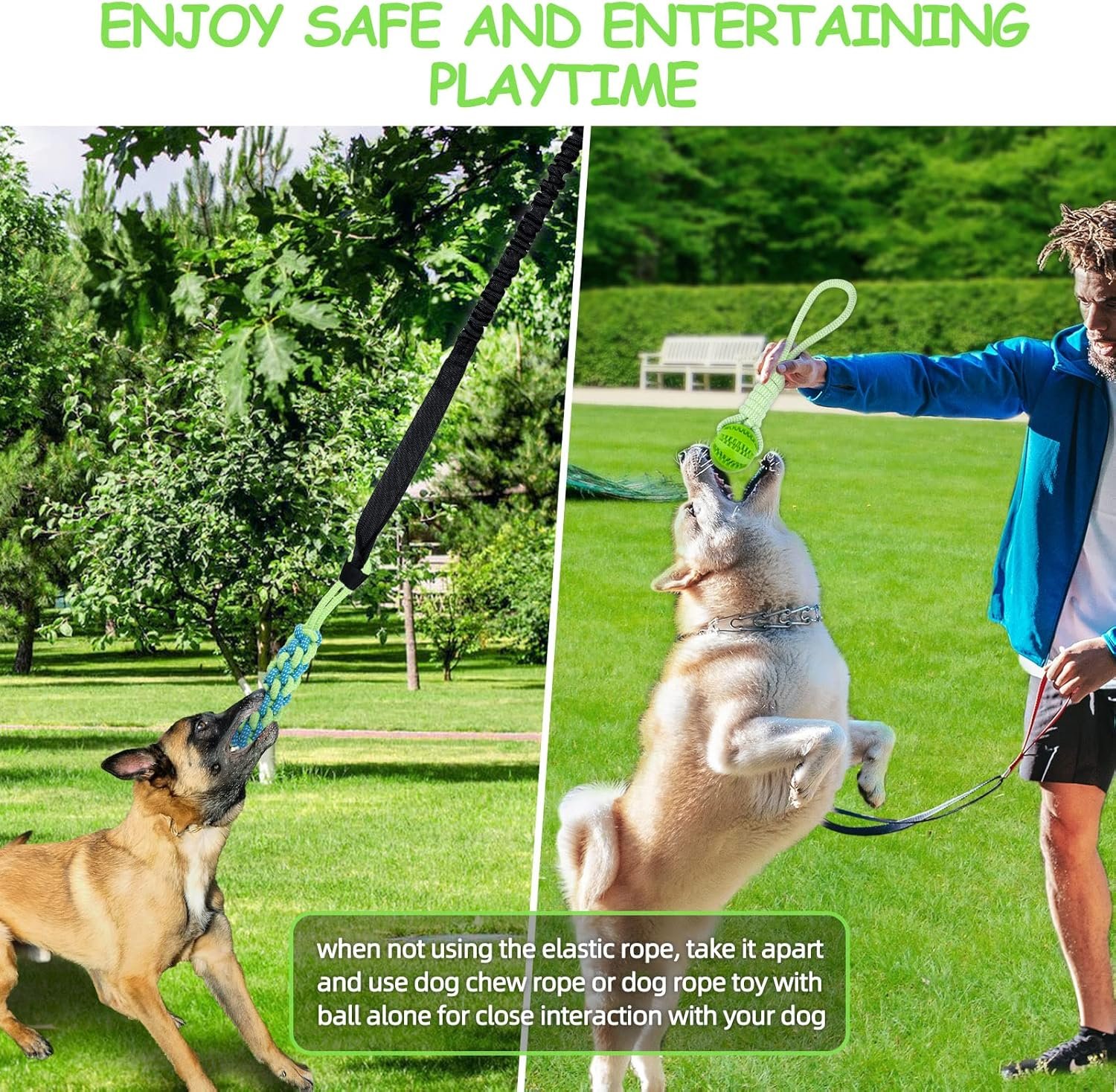 【 Easy to Install & Carry 】 Adjustable elastic bungee cord 5.25ft in natural state, 8.2ft after stretching, easy to install, loop it and pull it snug, and it’s ready to play. You can take it when you go for a walk. Bungee dog toy rope accessories can be disassembled and assembled at will, when you are not using the elastic rope, you can take it apart and use dog chew rope or dog rope toy with ball alone for close interaction with your dog.