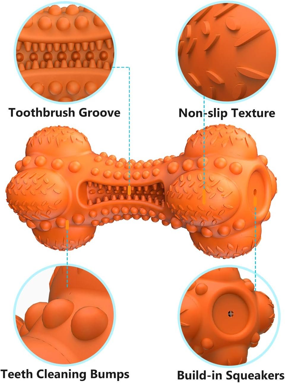 This engaging rubber squeaky chew toy features a patented design (Patent No. D972235S).Its unique structure generates captivating squeaks to instantly capture your dog’s attention. Crafted for durability and safety, it’s perfect for satisfying your dog’s chewing needs and helping keep your pet’s teeth clean and gums healthy.Kindly Reminder: The rubber bones are strong, but not indestructible. To ensure dogs’ safety and prevent accidental swallowing, please keep dogs under supervision while they are playing with toys.