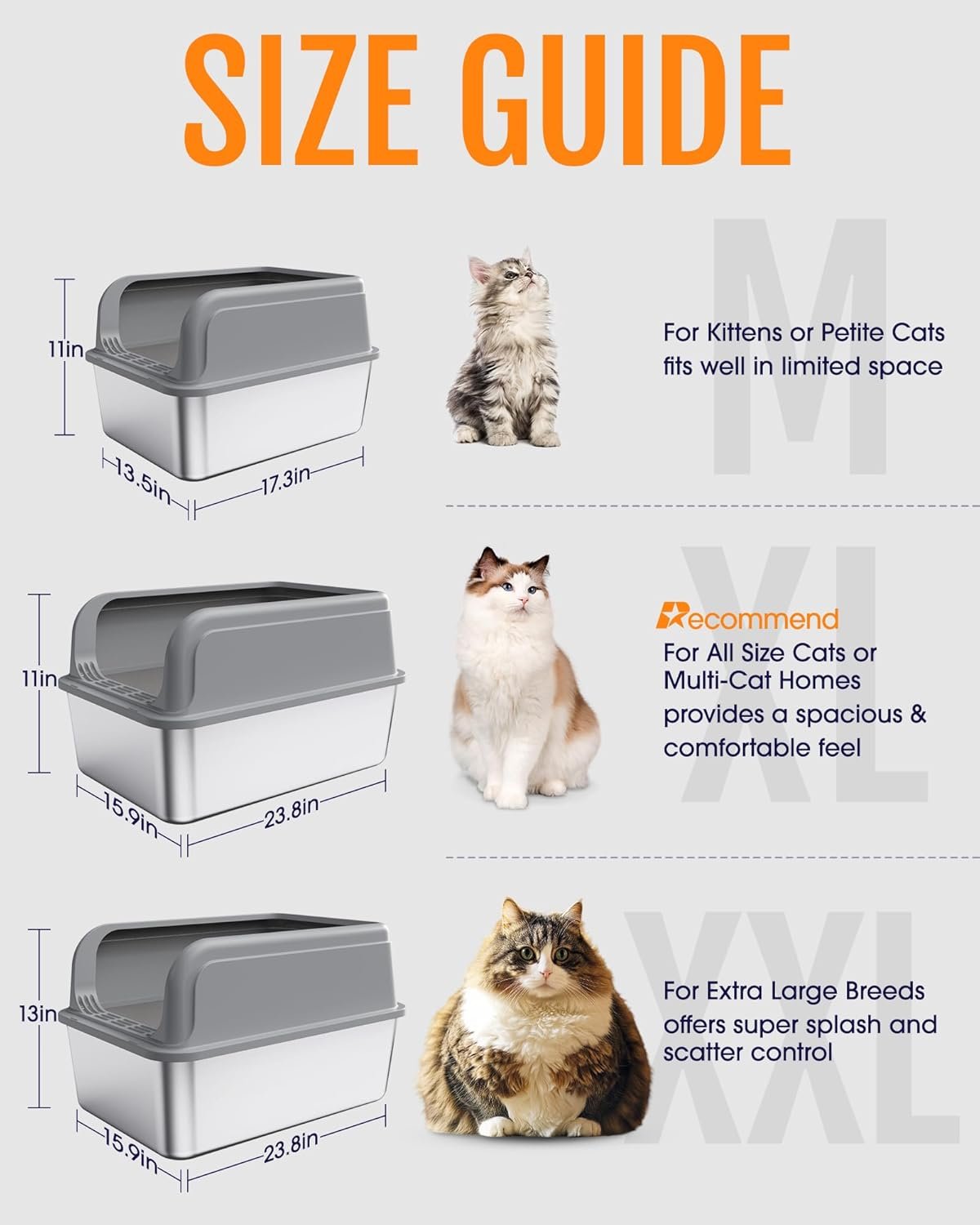 3-SIZE OPTIONS MEET YOUR NEEDS: Whether you have a playful kitten or multiple adult cats, this covered litter box offers three size options to meet their needs. Rest assured that your cats always have ample room to feel safe and comfortable. By offering the right fit, the litter box provides a peaceful, private space that makes your cats happy.