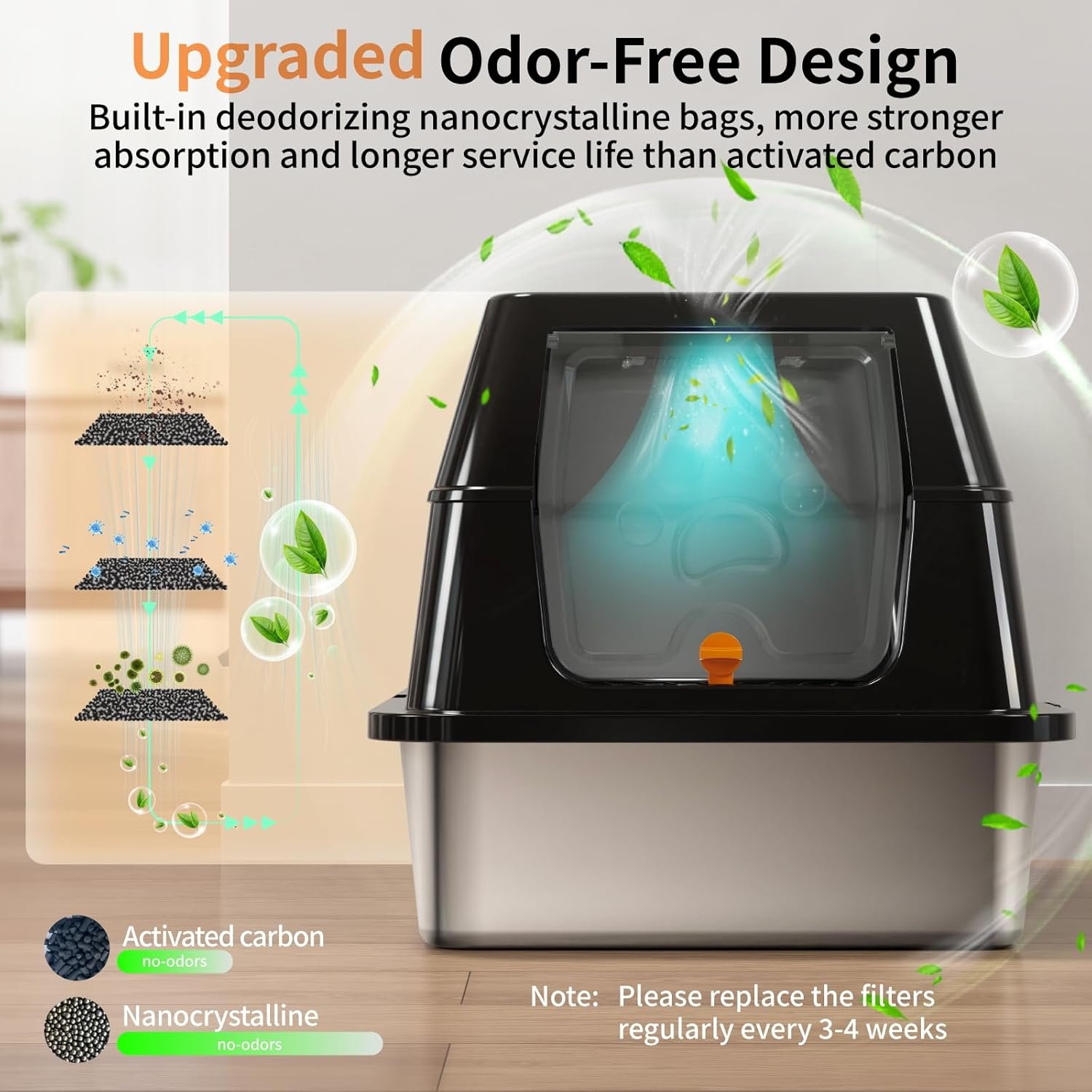 【Upgraded Odorless Design】The extra large litter box features a deodorizing box for placing nanocrystalline bags to absorb smells quickly, more stronger absorbption and longer service life than activated carbon, ensuring your pet and family with pure and healthy life.