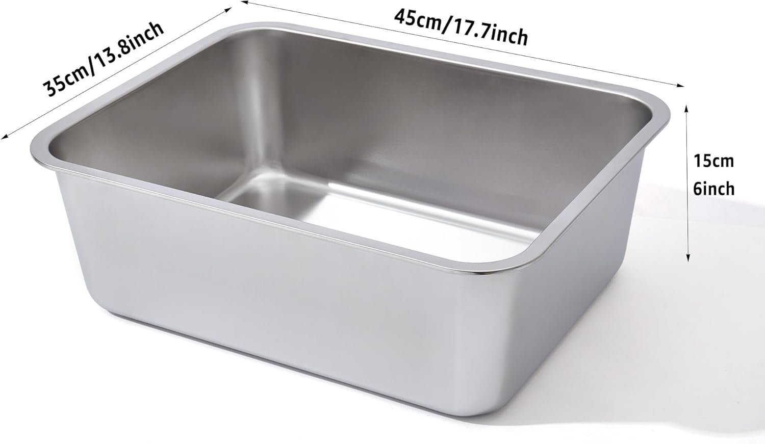 Stainless Litter box accurate size: 17.7″x13.8″x6″(L*W*H), normally tall enough to prevent litters and pee flying to everywhere.
