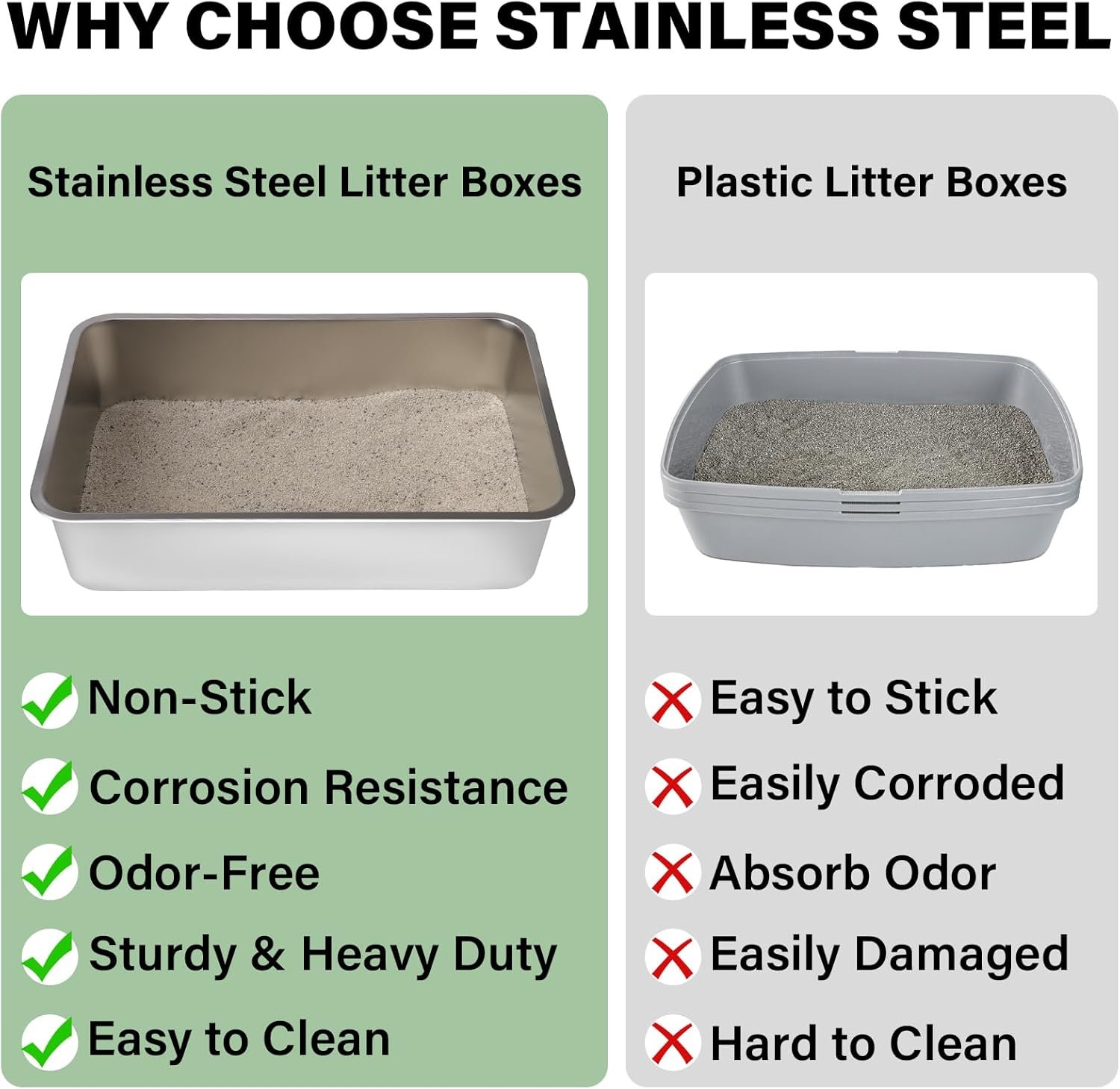 Steel litter box made by high quality stainless steel, which is no coating, non stick and no more odors any more.
