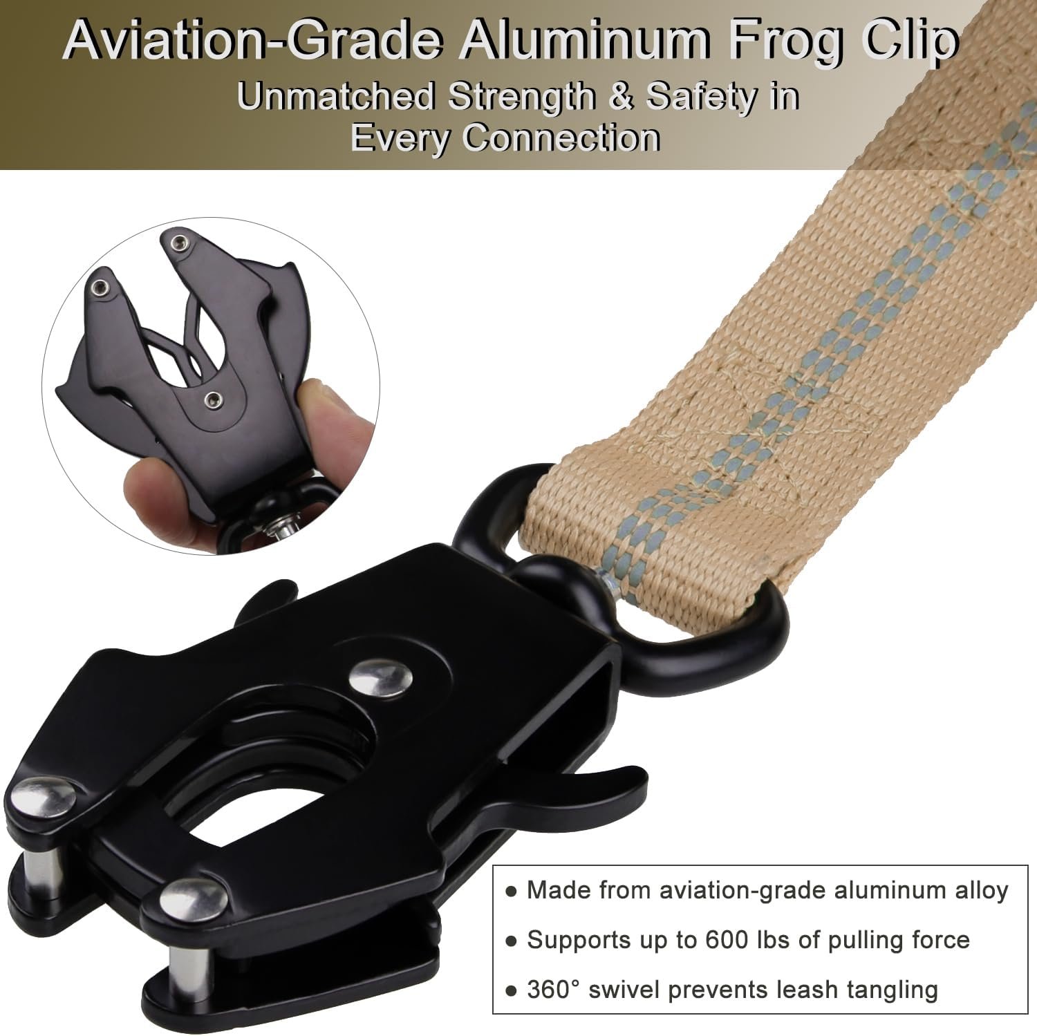 Heavy-Duty Aluminum Frog Clip: 360° rotating Frog Clip rated up to 600 lbs prevents tangling and twisting. Quick release design attaches easily to collars or harnesses while keeping large dogs safe and secure
