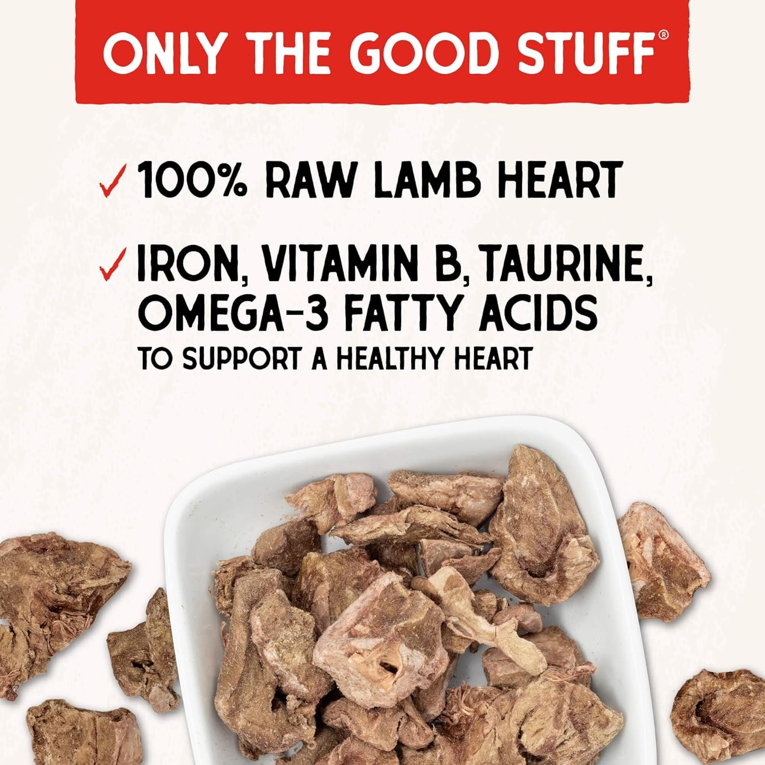 Made in the USA with one simple ingredient: 100% pure freeze-dried raw lamb heart.