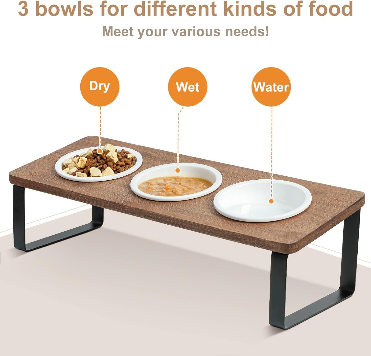 【FOOD-GRADE CERAMIC BOWLS】 The cat food stand comes with three food-grade bowls(Outer diameter: 4.7in), perfect for serving your cat with dry food, wet food and water, also suitable for multiple cats to eat together! Our ceramic bowls are microwave and dishwasher safe, convenient for everyday use and cleaning