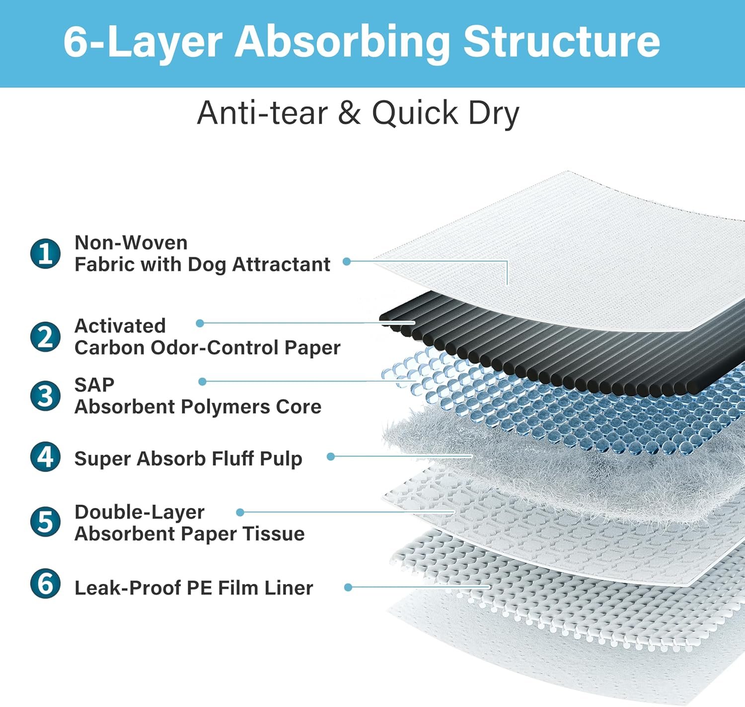 [5-LAYER CONSTRUCTION] Our training pads are made with 5 layers: non-woven cloth as the first layer to allow urine to flow through; the second and the fourth layers are made from paper tissue to add absorbency; the third layer is also the core layer is made from super-absorbent polymer, and the back layer is a water-proof plastic protecting layer.