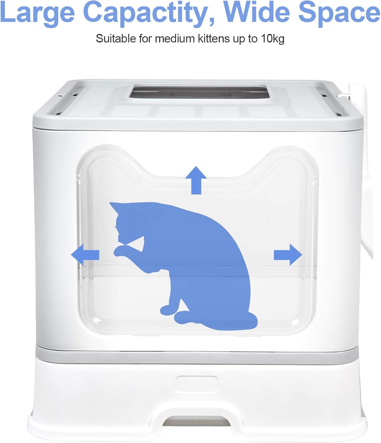 Low Tracking&Anti-Splash Design – This litter box is designed bottom-in and top-out,there has hollow hole on the top,when cat out,the tracking litter can fall down to the tray,come with deep drawer tray that can effectively anti splash and leak