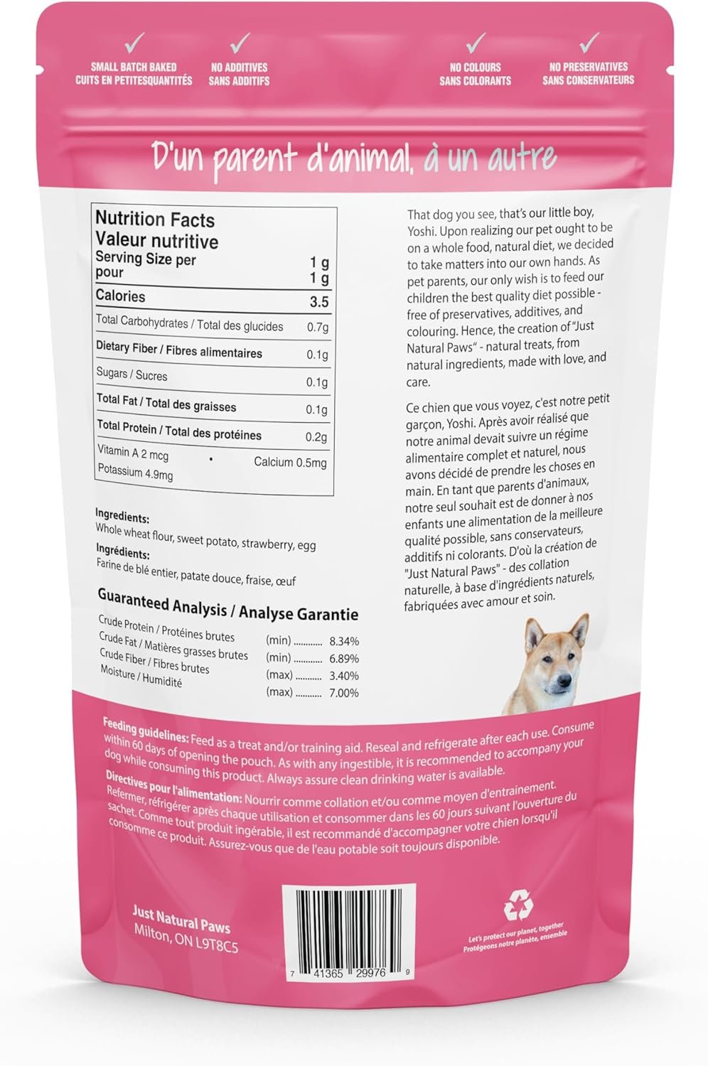 MADE IN CANADA WITH LOVE: Our healthy dog treats are proudly made in Canada in small batches to ensure quality. Each pouch helps support local animal welfare initiatives—treats with purpose!