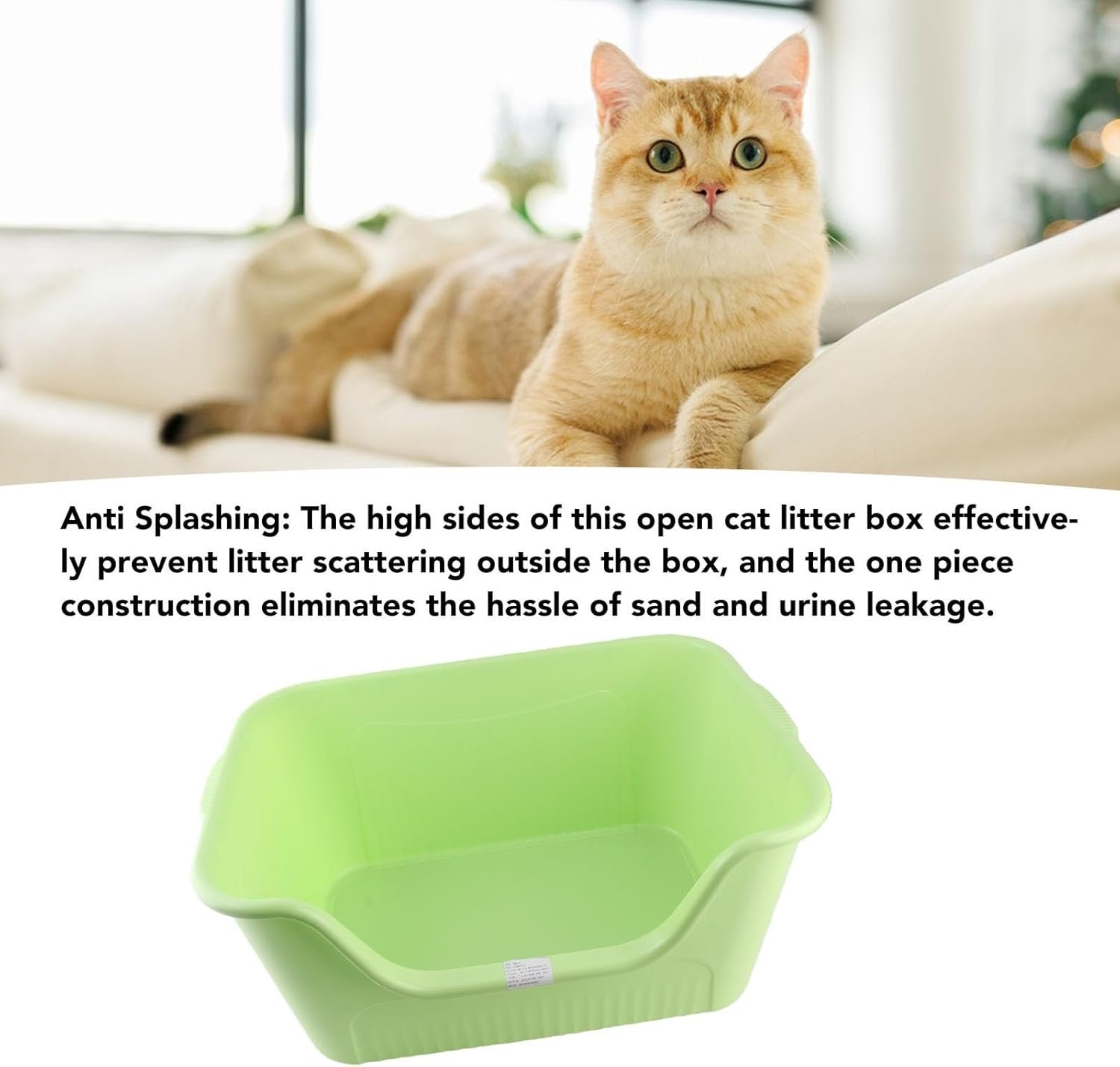 Anti Splashing: The high sides of this open cat litter box effectively prevent litter scattering outside the box, and the one piece construction eliminates the hassle of sand and urine leakage.