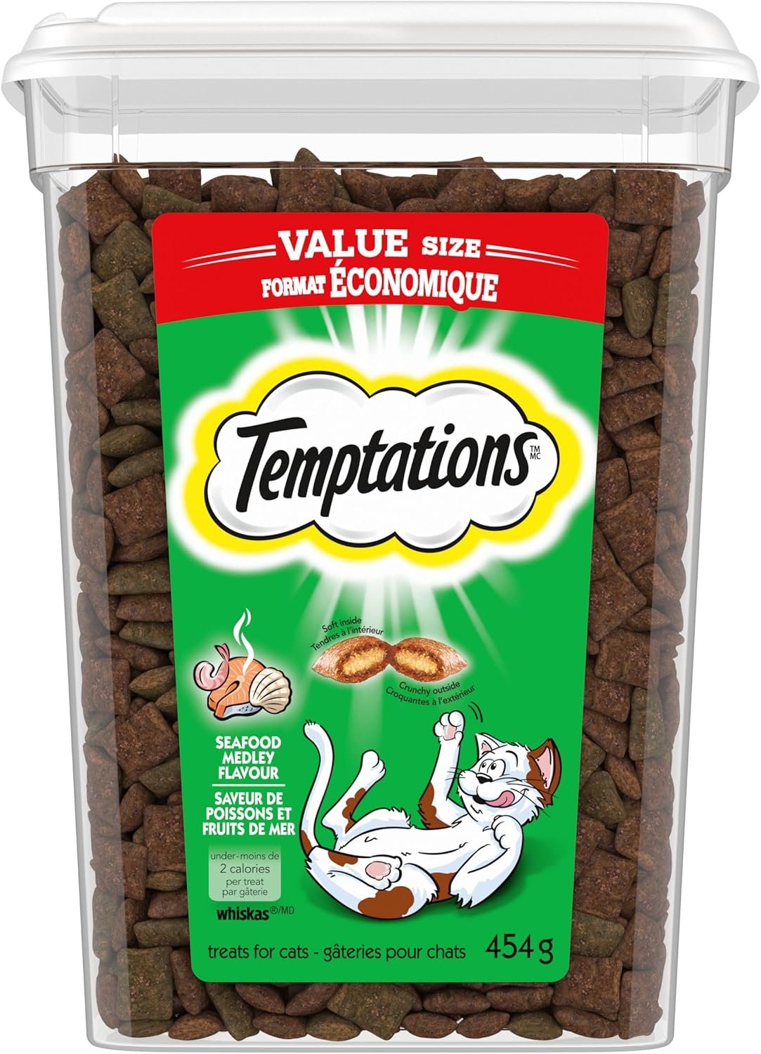 CONTAINS: One (1) 454g tub of TEMPTATIONS Cat Treats, Seafood Medley Flavour, Value Size