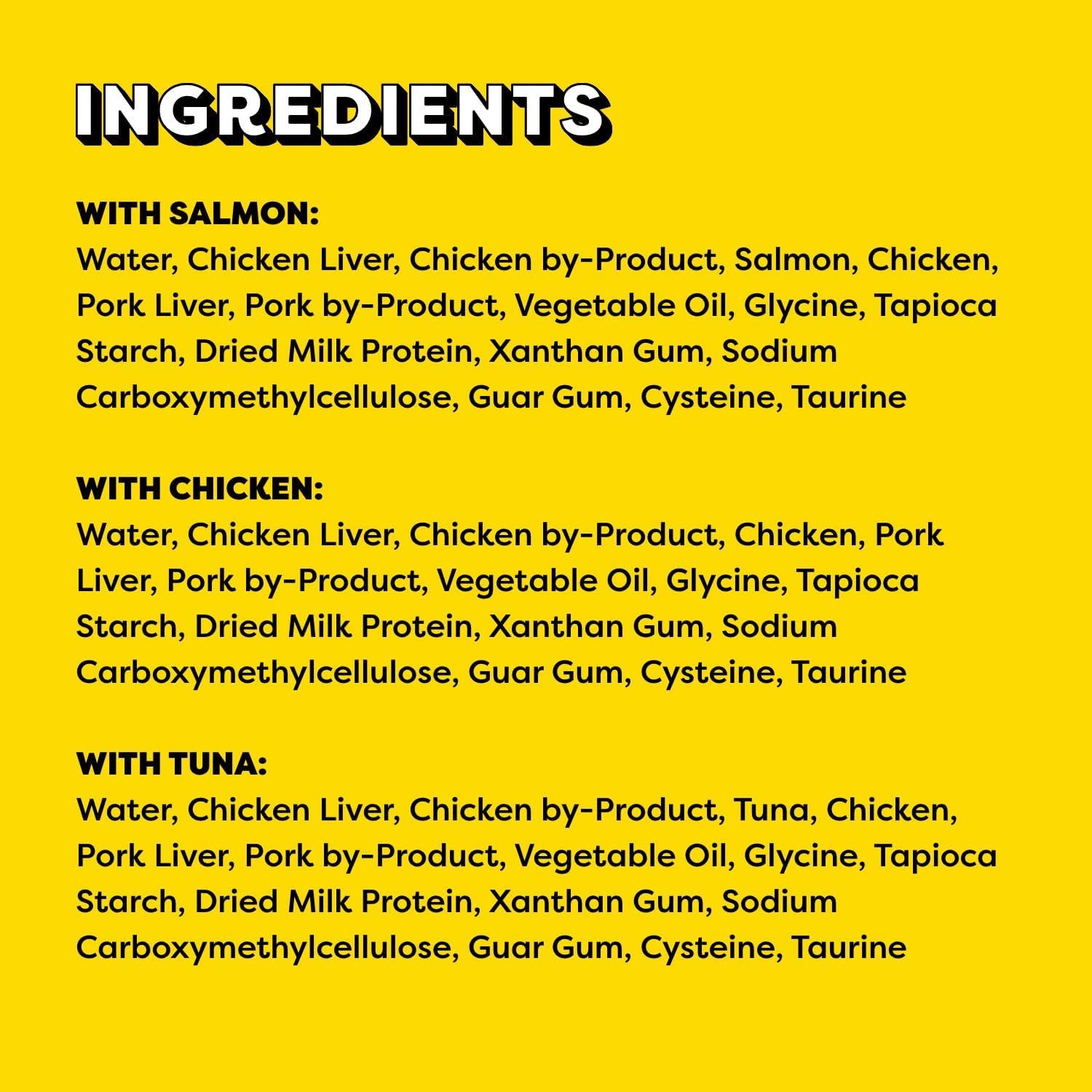 CONTAINS: one (1) 24 count of 12g Cat Treat Tubes of TEMPTATIONS Creamy Puree with Eight (8) Chicken Lickable Cat Treats, Eight (8) Salmon Lickable Cat Treats, and Eight (8) Tuna Lickable Cat Treats