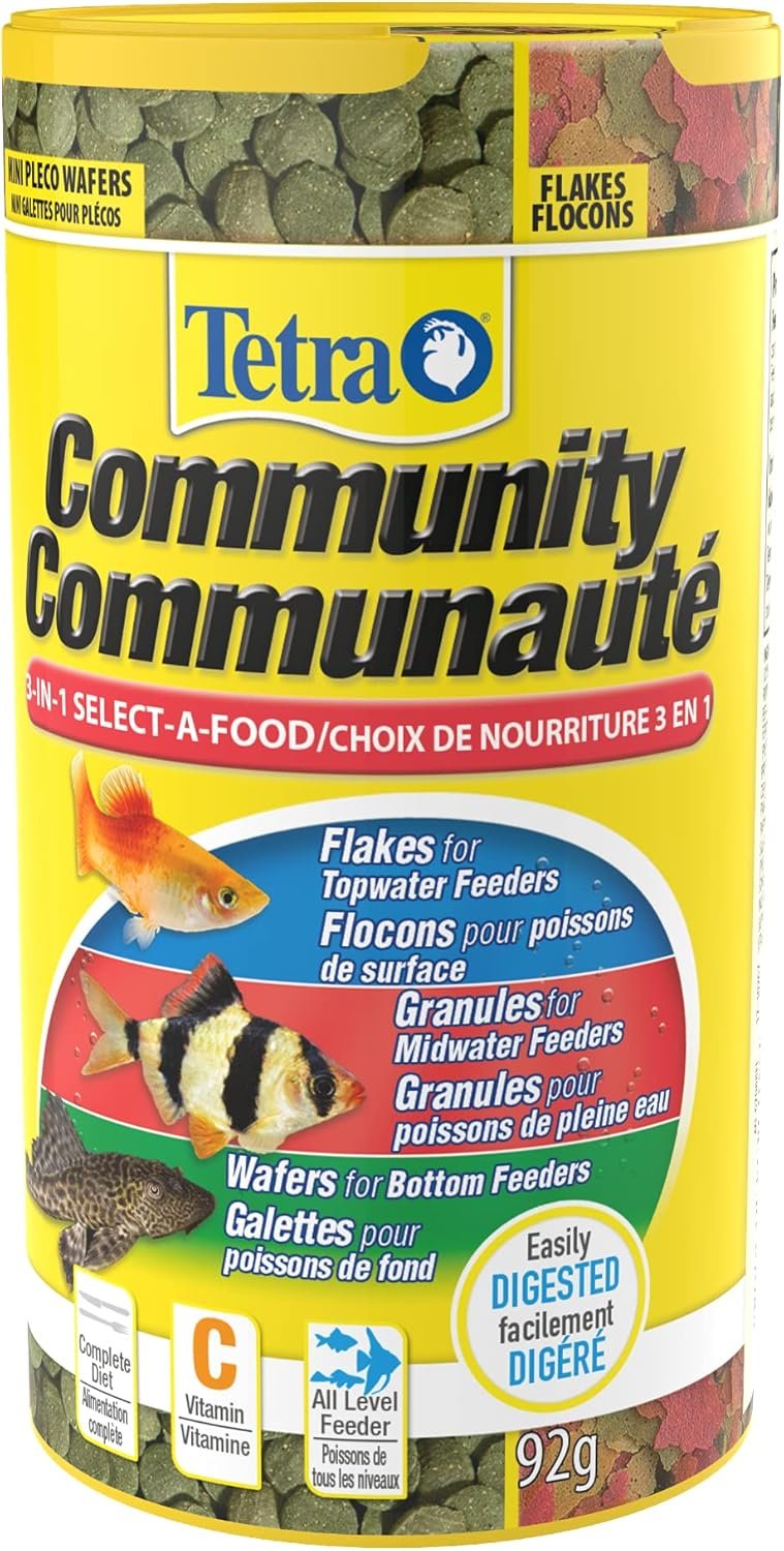 Tetra Community 3-in-1 Select-A-Food is a complete diet fish food for all levels of feeders that provides healthy variety and feeding fun for your entire aquarium community. The unique; multi-section canister contains three foods in one can – TetraMin Tropical Flakes for top-water feeders; slow-sinking TetraMin Granules for mid-water feeders and mini wafers for bottom-feeding herbivores. Contains the Tetra Active Life Formula; with antioxidants for healthy cells; select proteins for growth and prebiotics for digestion. Active Life Formula helps nutritionally support fish’s immune system for optimal health and long life. The easy-to-use dispenser top allows you to dial in the food you want! Feed your fish two to three times daily with the staple flake; only as much as your fish can consume within several minutes. Feed with granules and mini wafers several times per week in addition to the staple flake diet. This food will not cloud water when used as directed.