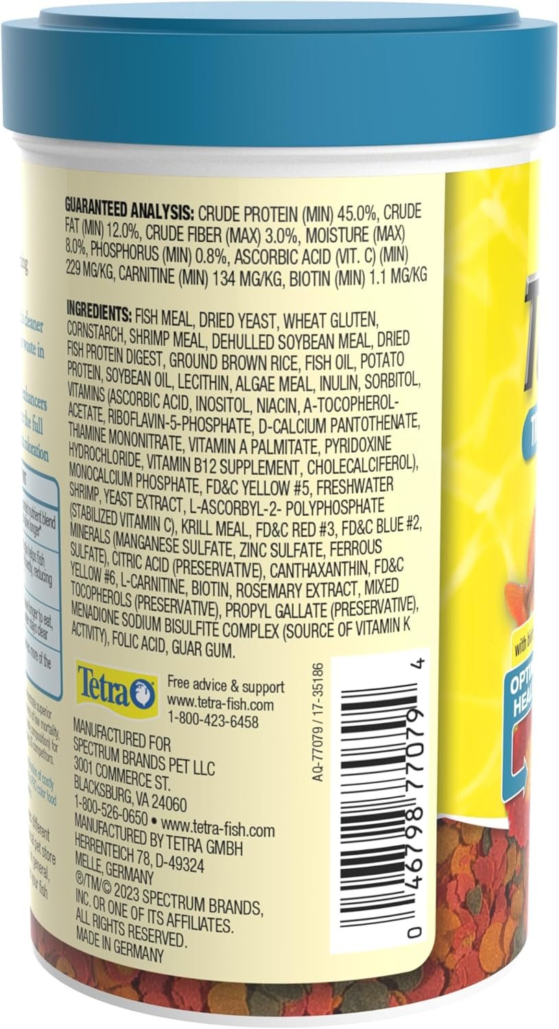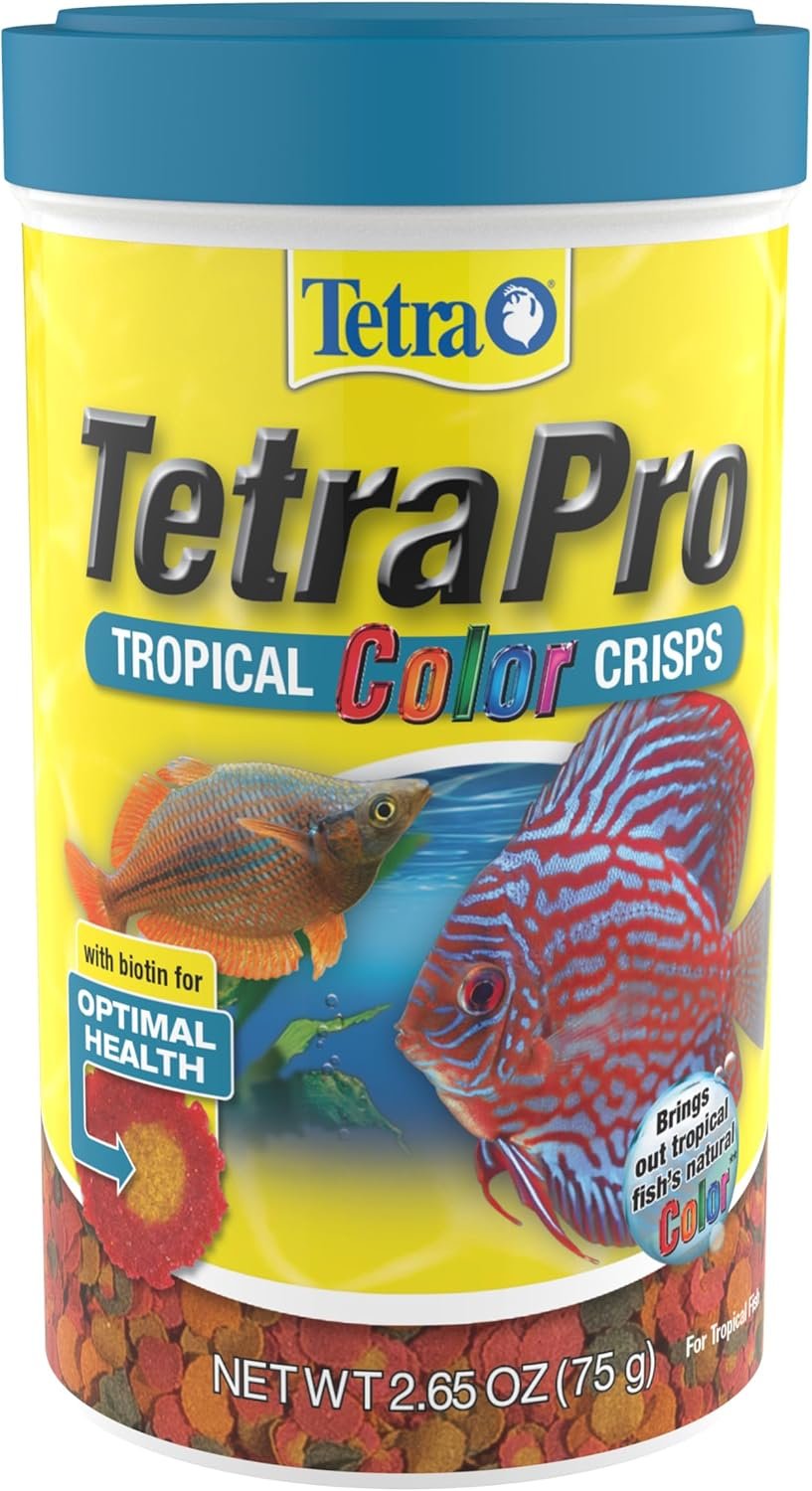TetraPro Tropical Color Crisps offer a nutritionally balanced diet and beautiful color for tropical aquarium fish. With a high content of natural color enhancers and specially selected ingredients, this food ensures the full development of beautiful and rich coloration. These crisps float longer, so fish have longer to eat, the food gets eaten, and the water stays clear. An optimized protein-to-fat ratio helps fish metabolize food more efficiently, reducing waste in the aquarium. Each TetraPro Tropical Color Crisp is made using an exclusive low-heat process that preserves essential nutrients for a healthier, more nutritious diet. The precision-crafted, multi-faceted nutrient blend includes biotin to help support fish’s immune system. Feed two to three times per day, only as much as your fish can consume within three minutes. Each fish species has different feeding requirements. Consult your local pet store for specific instructions for your fish. Uneaten food can cause water-quality problems. This food will not cloud water when used as directed.