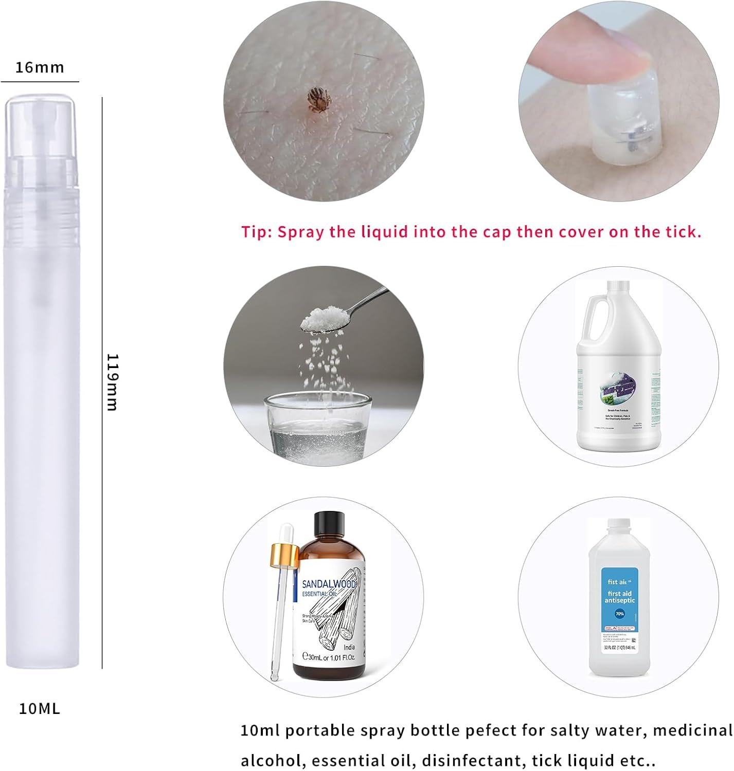 The spray bottle can use to hold, slaty water, soap water, medicinal alcohol and more care liquids. The cap of the spray bottle can use to hold liquid and cover on the tick to make it asphyxia. Plus, a plastic collection case to securely store ticks for submission to labs for testing or Show it to the doctor.