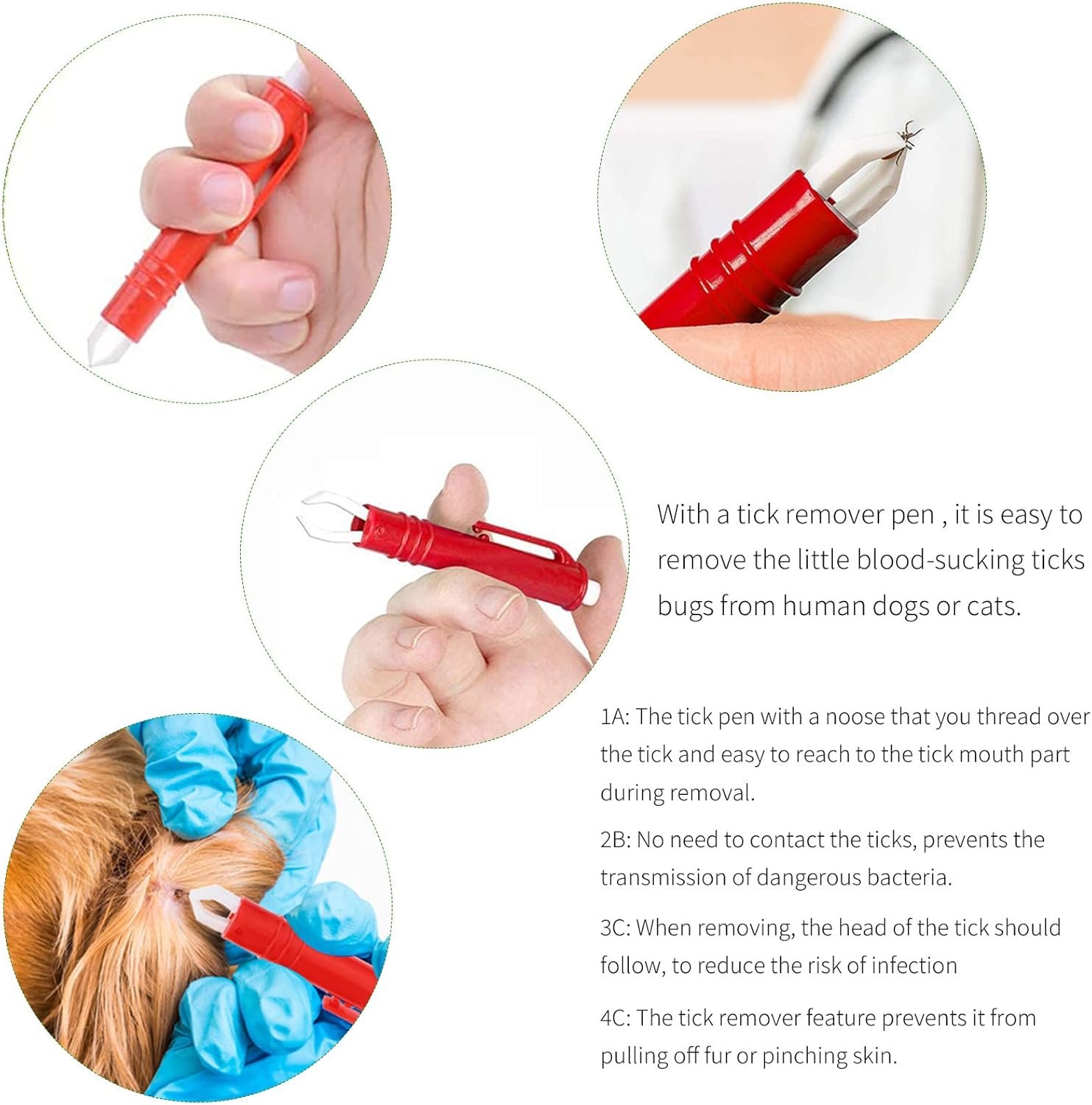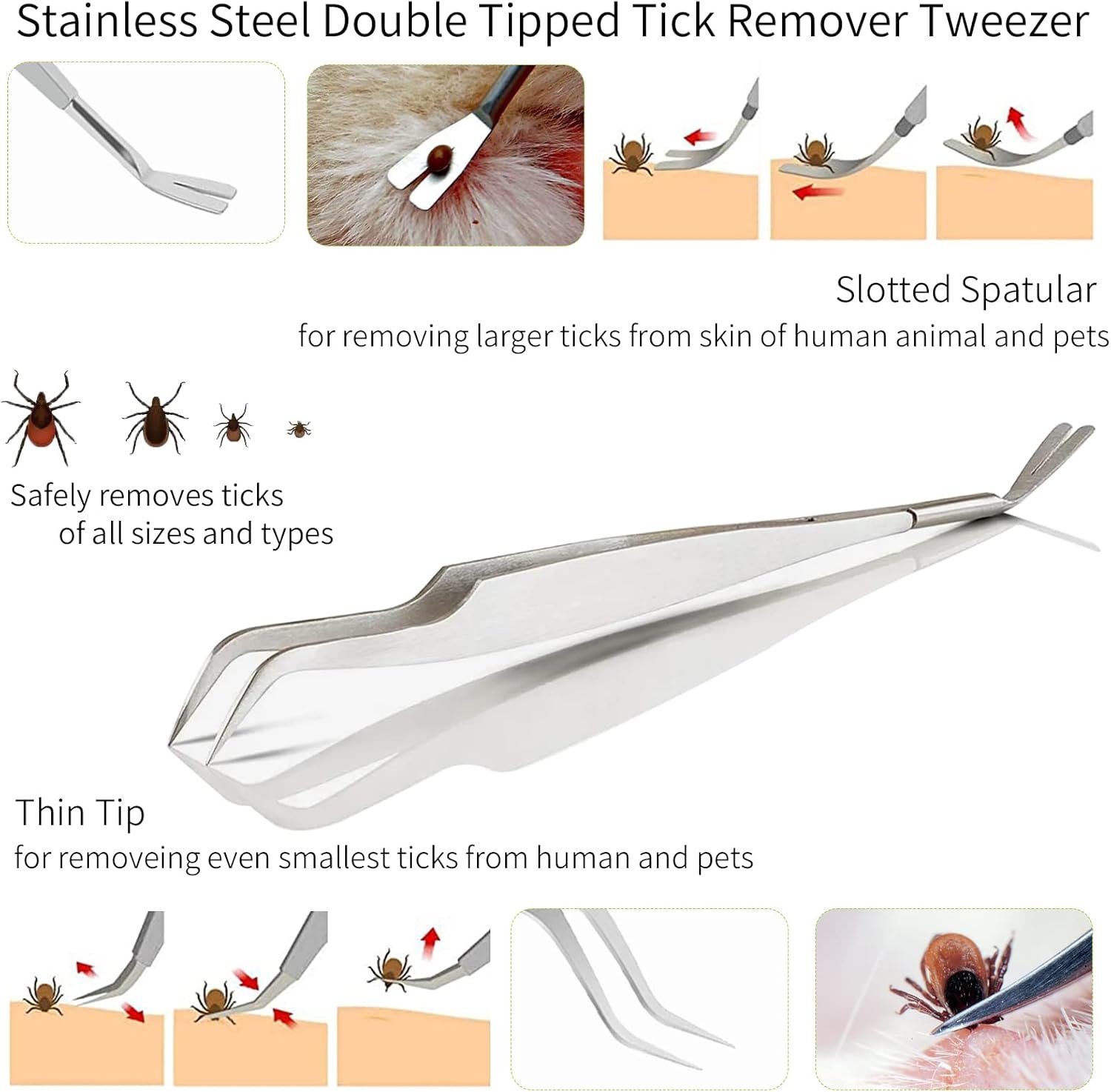 Tick removal tweezers: The tick remover resemble regular tweezers but have specially designed tips with a narrow gap. The tips are easy used to grasp the tick mouthpart that close to the skin and remove it by pulling straight upward. Two ends multi-pourpose, can remove ticks of all styles and sizes.
