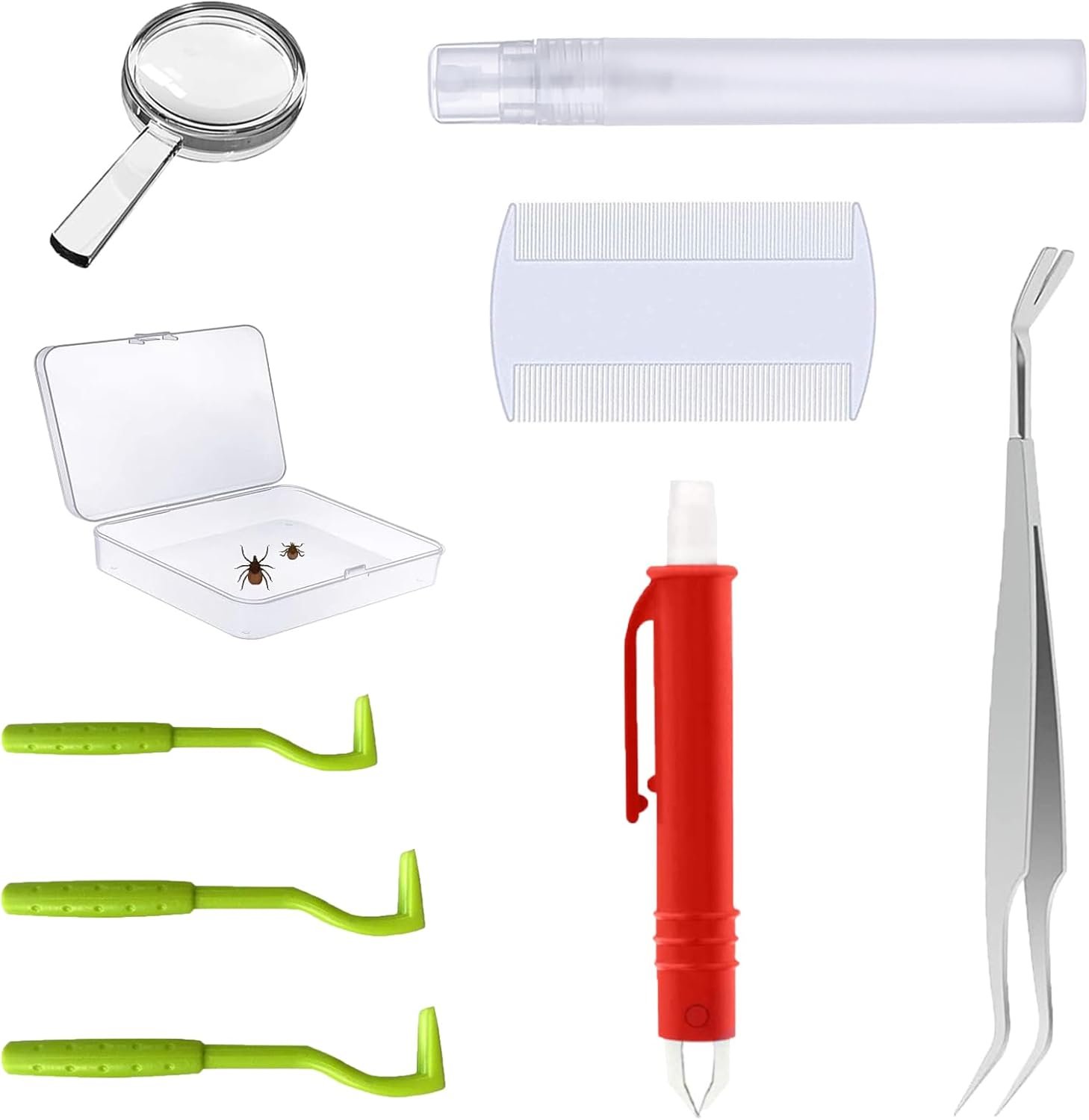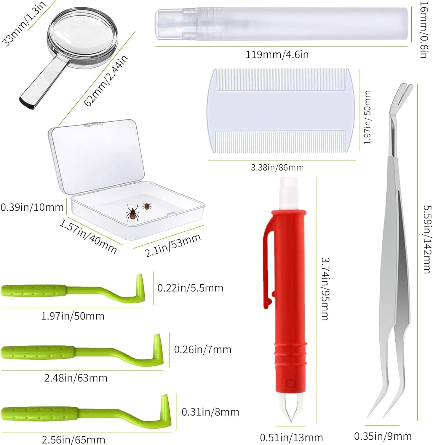 Includes specially tick removers: Fine point tweezer, magnifyer, S M L 3 size tick crowbar, flea comb, tick case, tick pen and 10ml spray bottle. These tools in this kit remove ticks from humans and pets like dogs, cats and farm animals like horses.