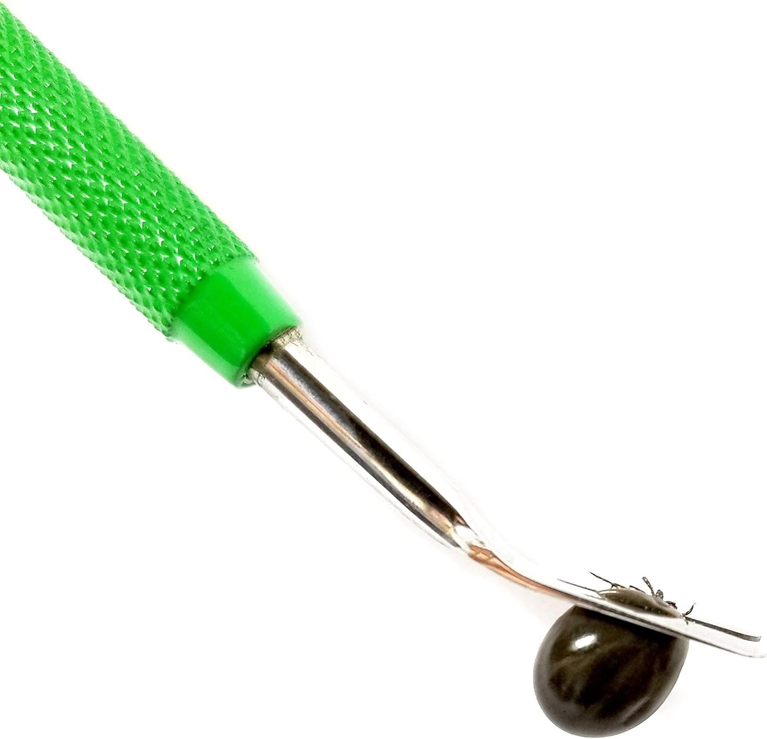 The stainless-steel tick remover tool features a non-slip grip and a forked tip designed for easily and completely removing larger, embedded ticks.