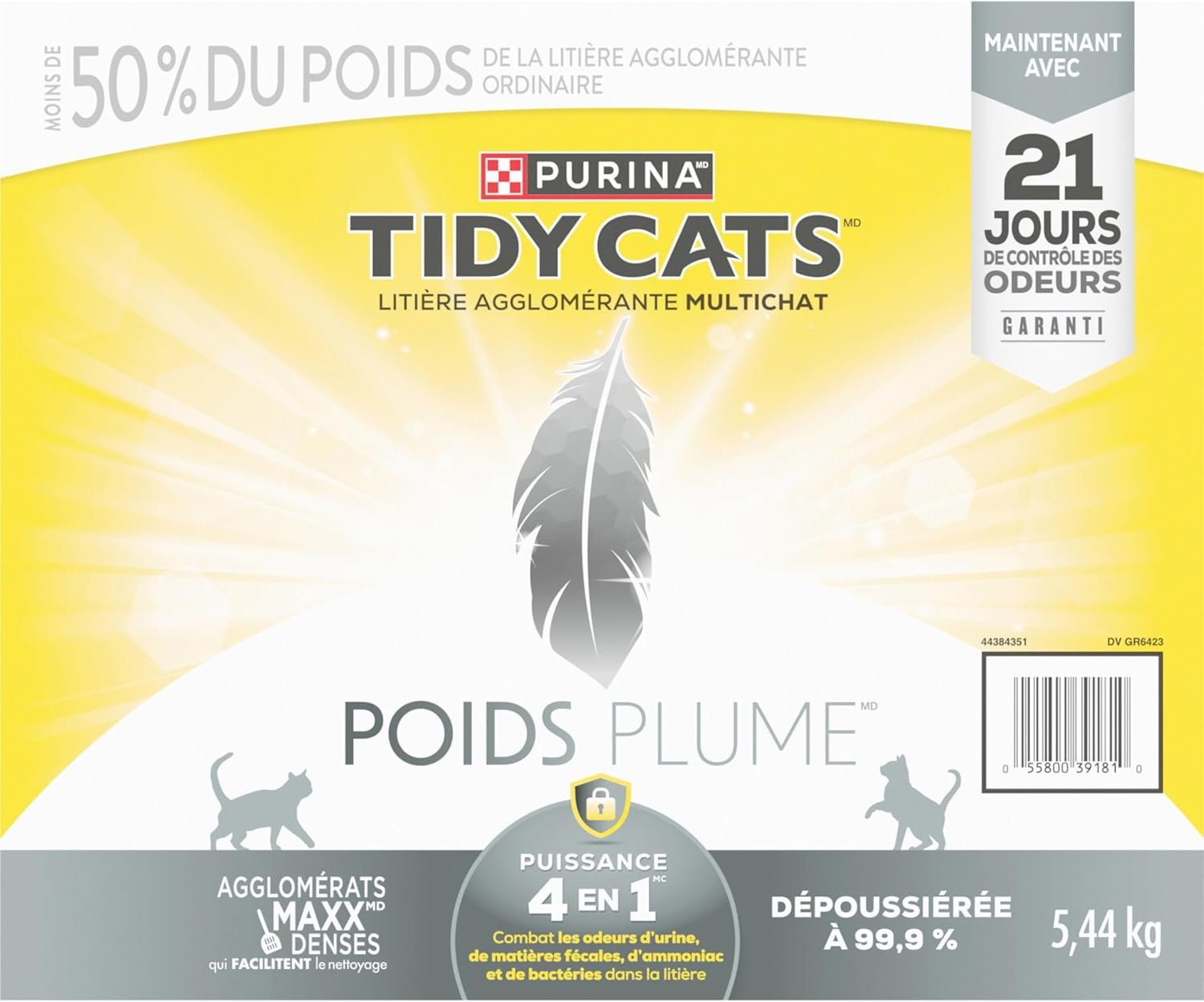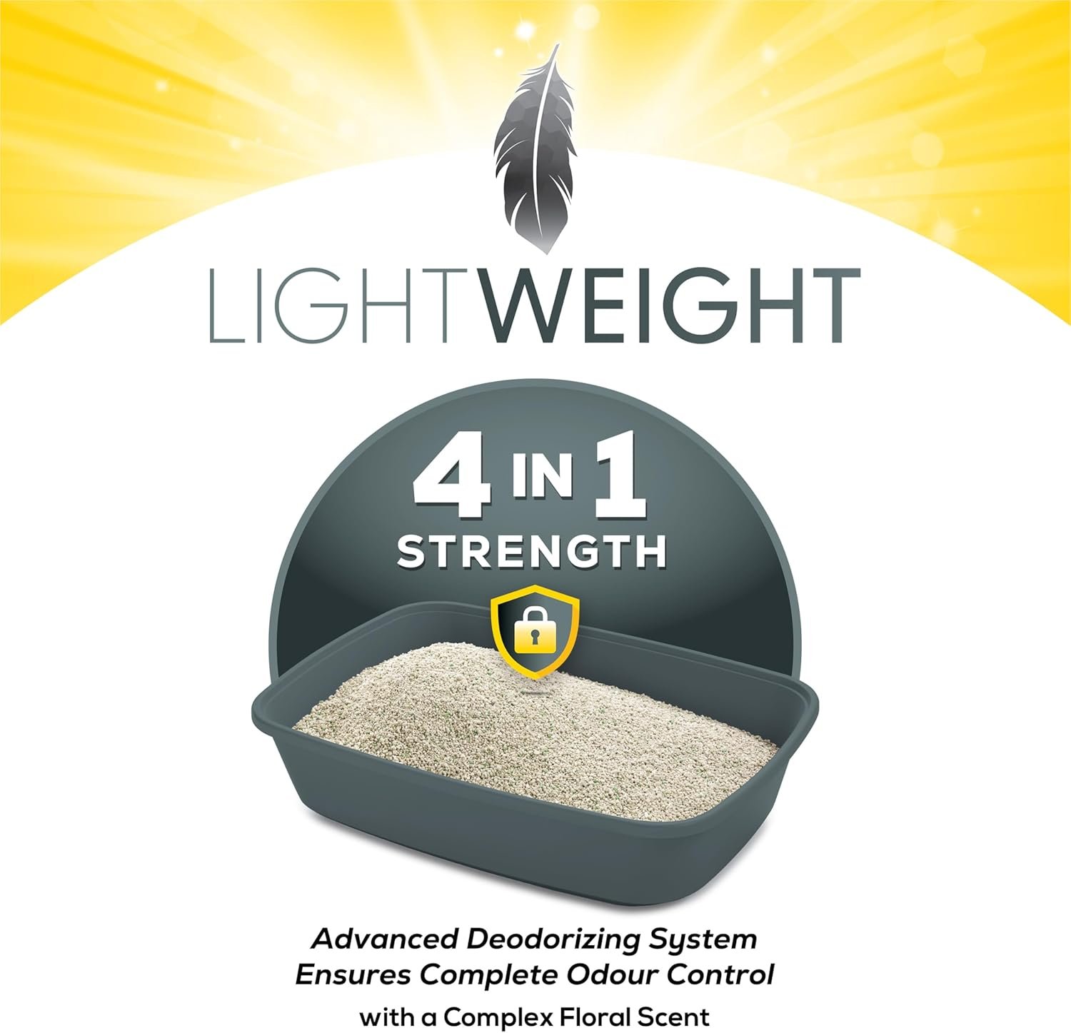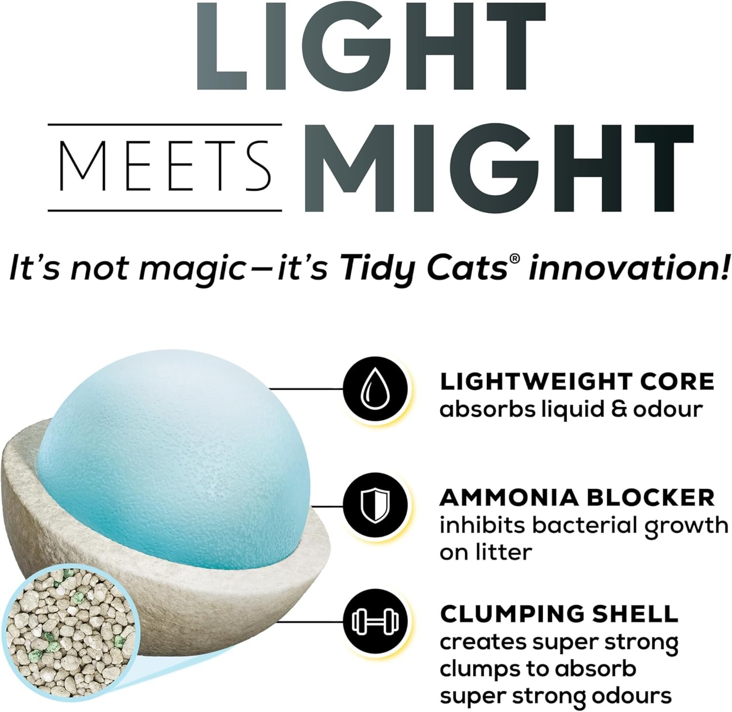 Deliver powerful odour protection with Tidy Cats 4-in-1 Strength lightweight cat litter. Formulated to attack and neutralize cat litter odour caused by ammonia, urine and fecal odours, this kitty litter leaves your home smelling fresh, clean and ready for your feline friends. Formulated for households with multiple cats, this 99.9% dust free litter prevents ammonia odour for 14 days guaranteed, when used as directed. The light, powerful clumps make scooping quick and effortless, so you can spend less time tending to each cat’s litter box and more time playing with your cat companions. Tidy Cats litter is half the weight of the leading clumping cat litter, making it easy to carry, pour and store. Check litter box maintenance off your to-do list with a convenient odour-neutralizing solution.