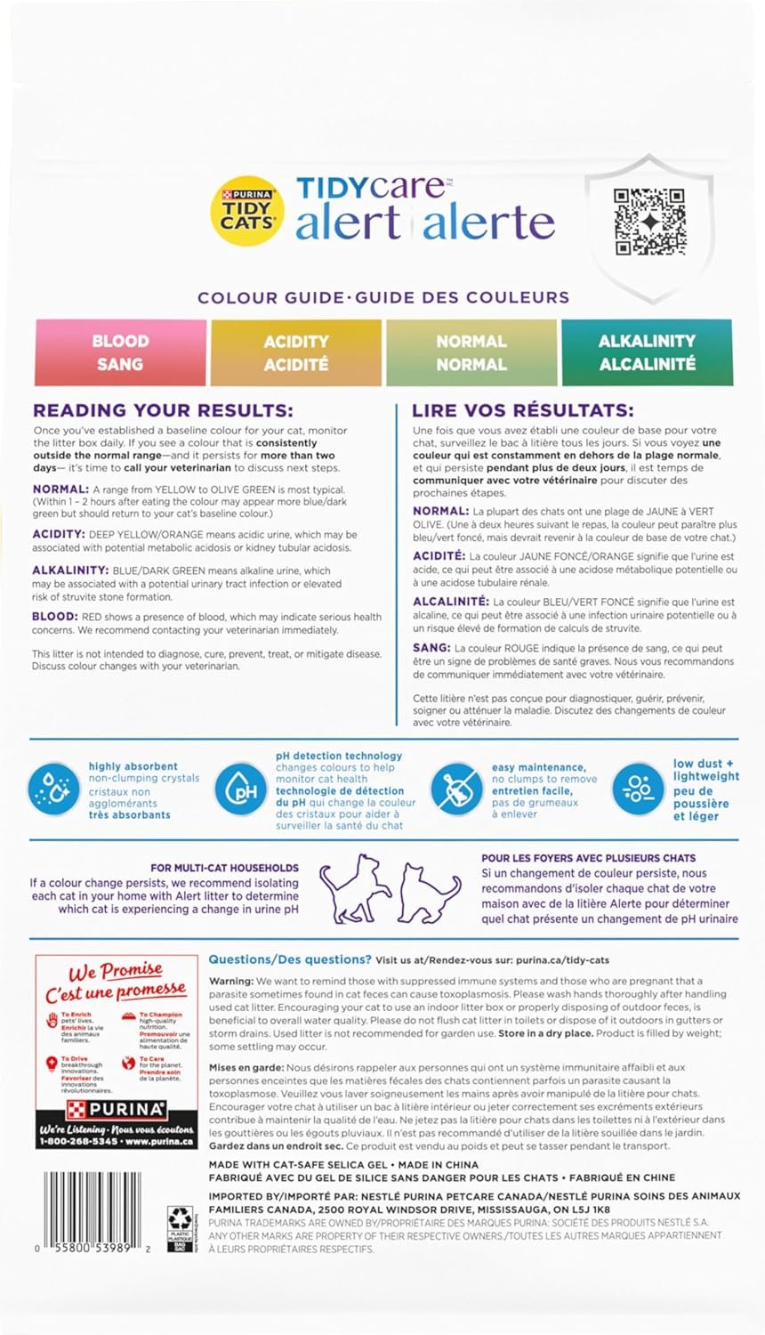 Tidy Care Alert helps you monitor your cat’s health, using colour-changing crystals to measure urine pH and alert you to potential health concerns. These cat-safe crystals are highly absorbent and non-clumping—just remove solids and stir the litter daily to ensure maximum absorption and odour control. Simplify litter care and keep an eye on your beloved cat’s health with Tidy Care Alert.