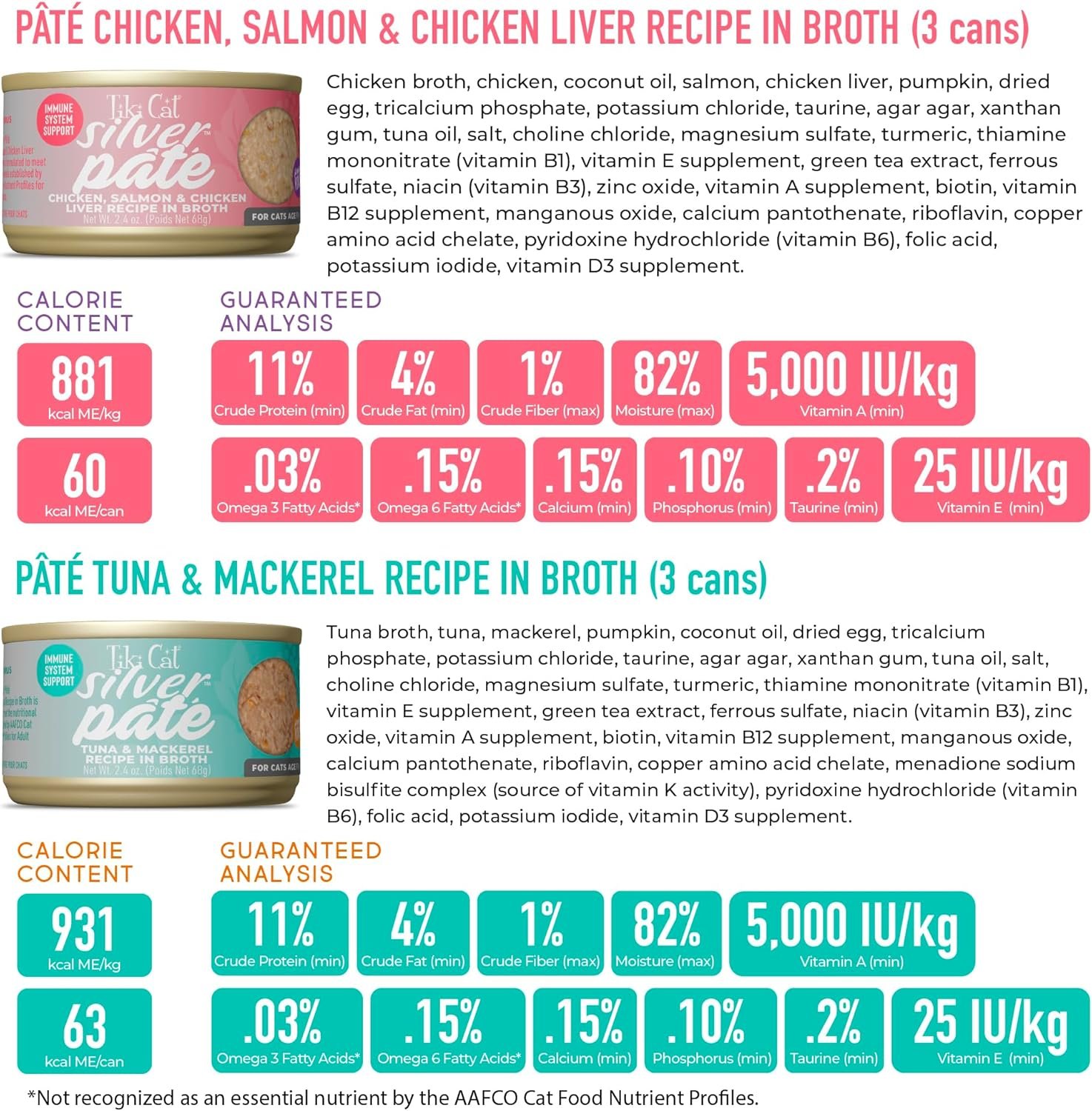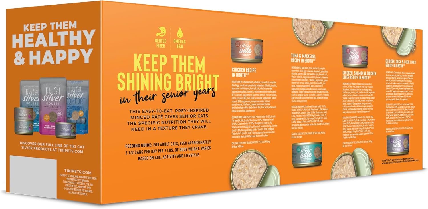 Keep your cat shining bright in her silver years with precise nutrition for older cats in a soft, easy-to-eat pate. Especially formulated for cats aged 11+ years, Tiki Cat SilverTM wet cat food is made with high-quality proteins plus anti-oxidants to support immune health. Complete and balanced, grain free, with non-GMO ingredients. Give them the nutrition they need with the flavor they deserve in their silver years.