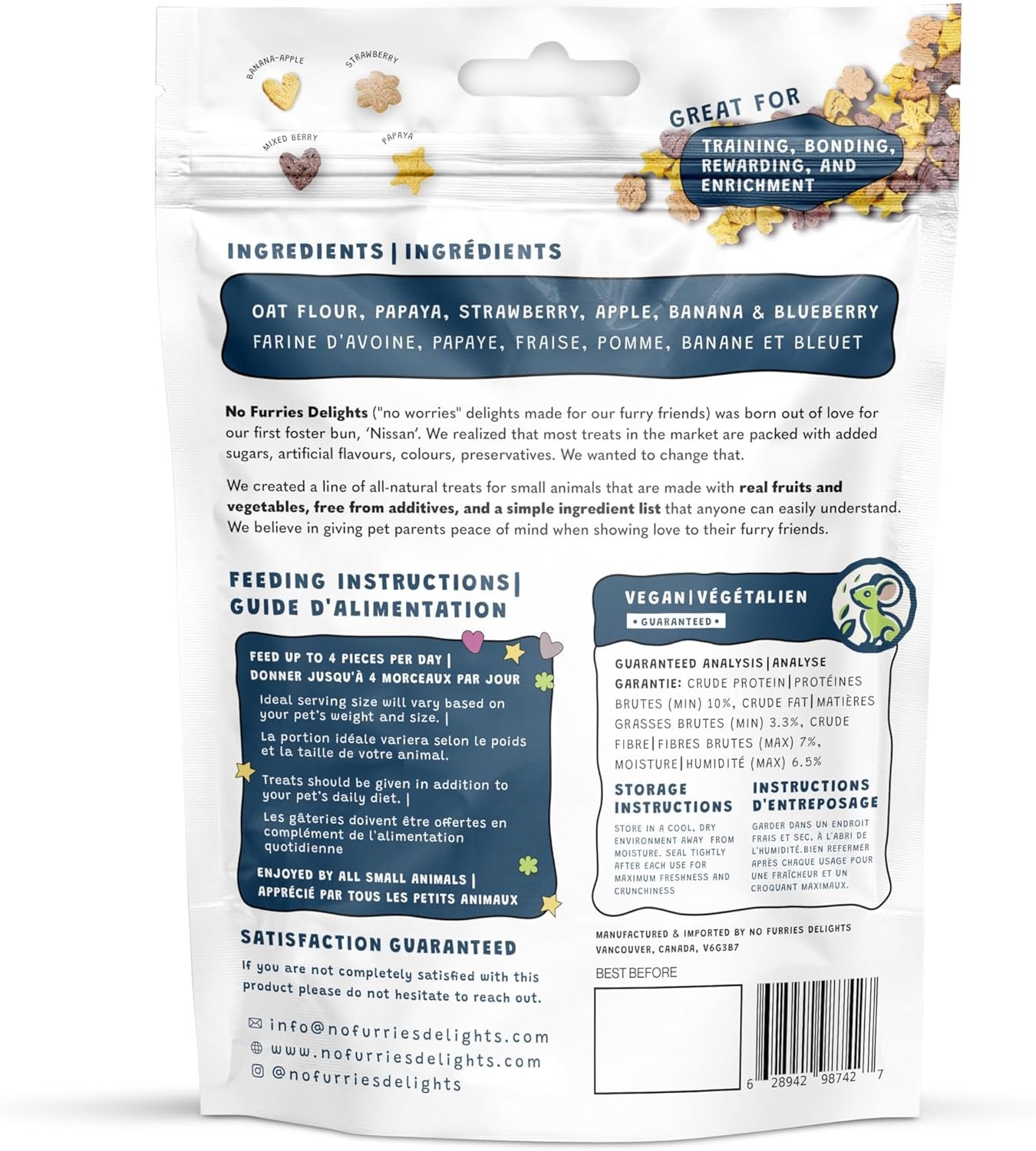No Furries Delights (“no worries” delights for our furry friends) was born out of our love for our first foster bun, Nissan. We realized that most treats in the market are packed with unhealthy additives like filler ingredients, sugars, artificial colours, oils, and preservatives that are not safe for small animals. We wanted to change that.