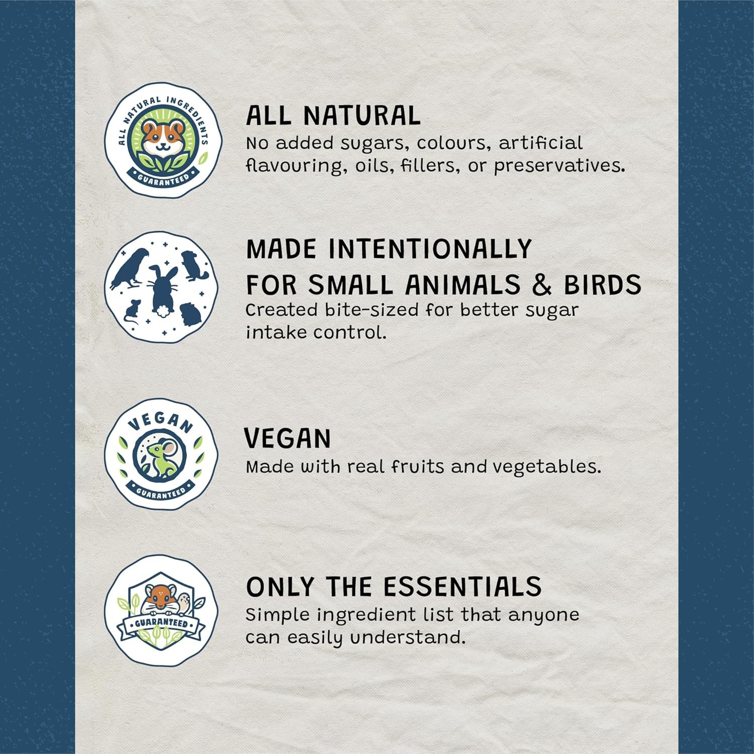 With our furry friends front of mind, we created a line of small animal treats that are made with all natural ingredients, free from added sugars, colouring, flavours, preservatives and filler ingredients.