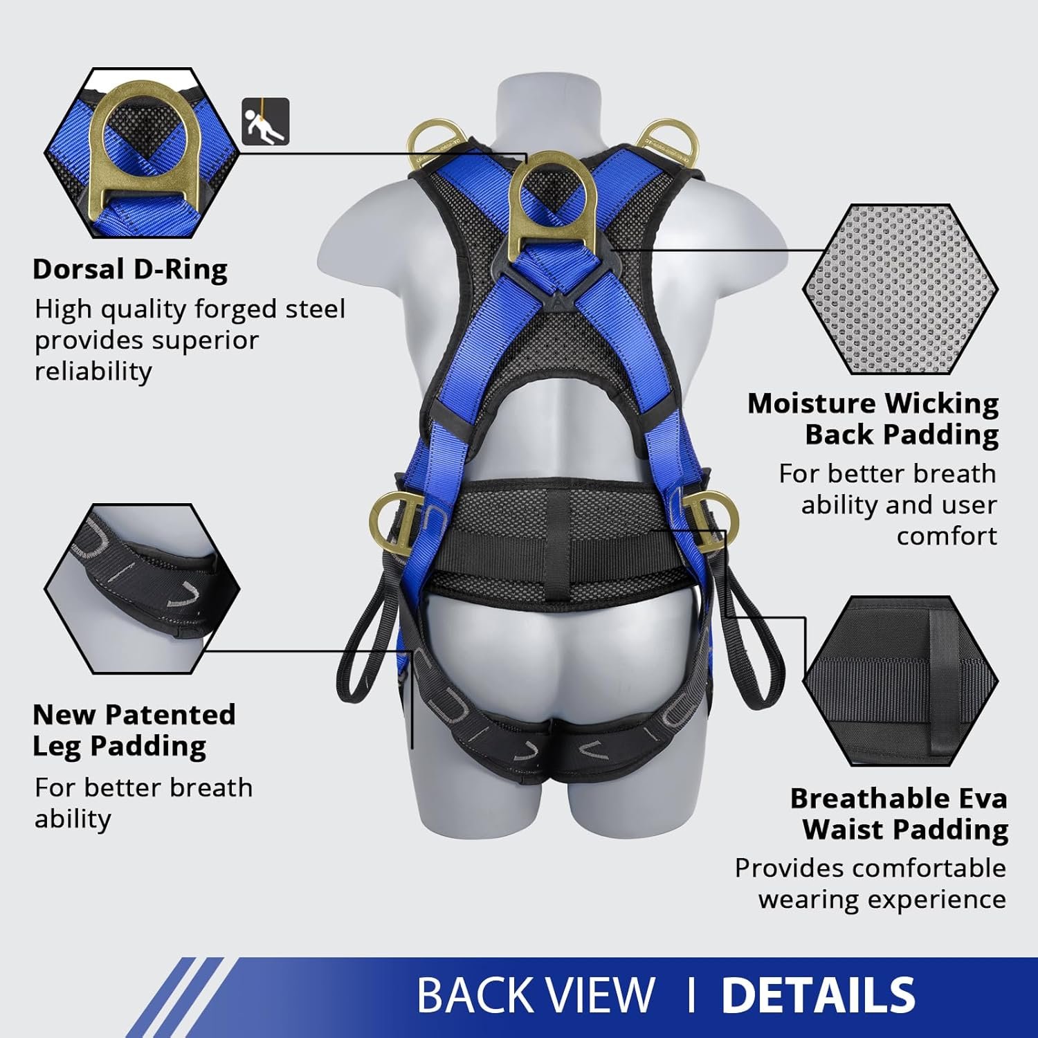 Patented shoulder, leg, and back padding upgrades minimize overhead muscle fatigue.