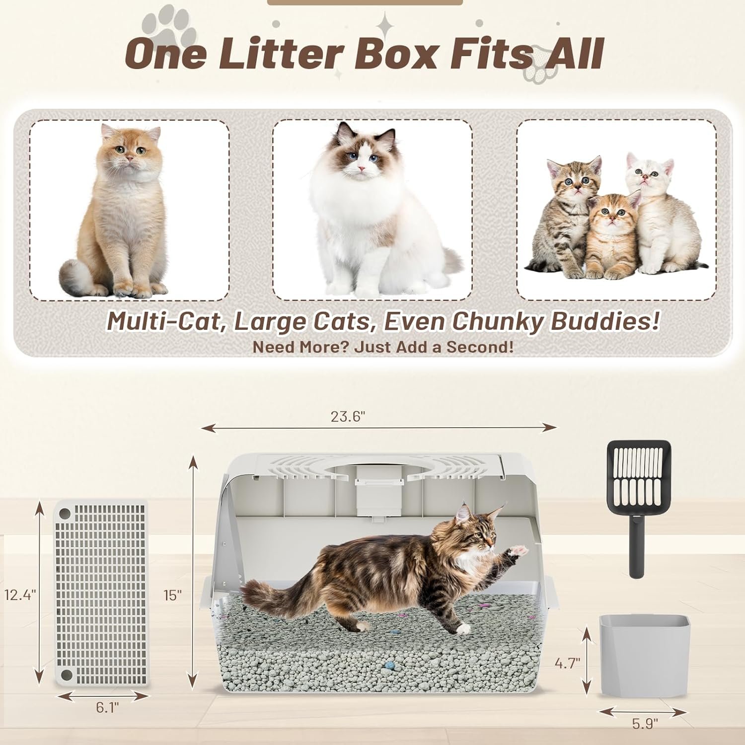 Complete Kit, Comprehensive Support:Everything included: lidded litter box, dual-sided scooper, filtration mat, mini trash can, and liners. Supported by a 1-year support and 24/7 customer care for assistance with setup, use, or parts.