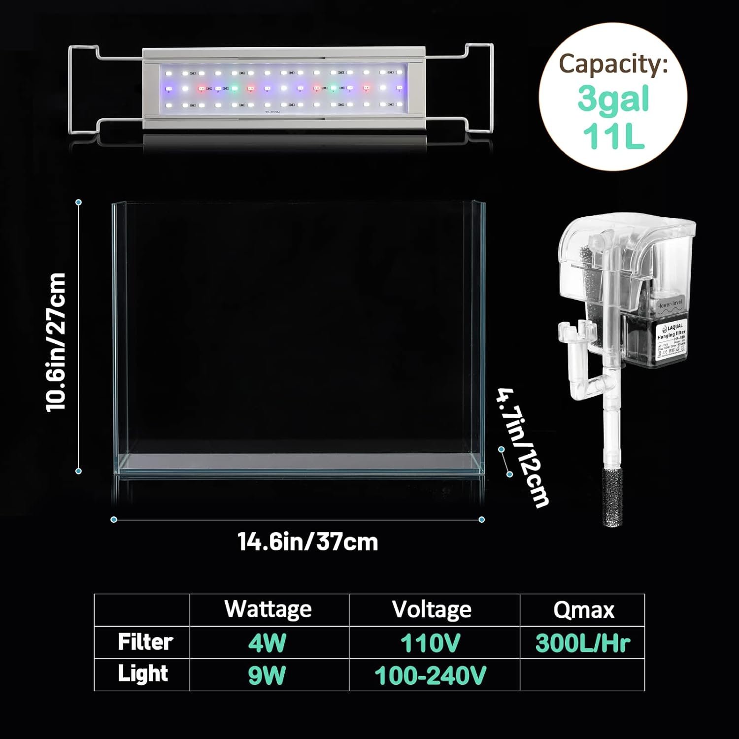 【Package Includes】 LAQUAL aquarium starter kit includes 1 * 3 gal ultra-clear fish tank, 1 * aquarium filter with surface skimmer & 1 * LED light. Everything you need is ready to go. Go ahead and start your journey to become a fish expert.