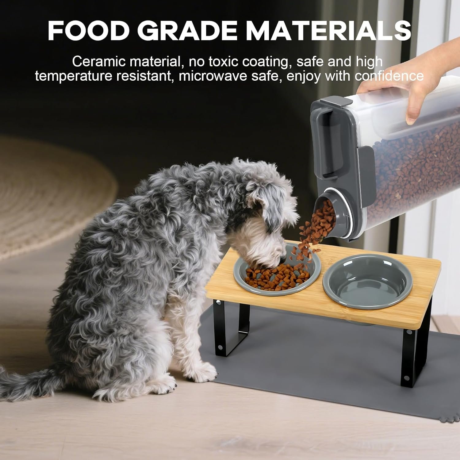 【Pet Safe Material】The slow feeding bowl and water bowl set are made of high-quality food-grade ceramic, which will not have the trouble of rusting and fading. It is detachable and very easy to clean. Just rinse it gently with water and it will be as clean as new. The natural odorless wood of the pet stand is waterproof and durable, so you can use it with confidence.