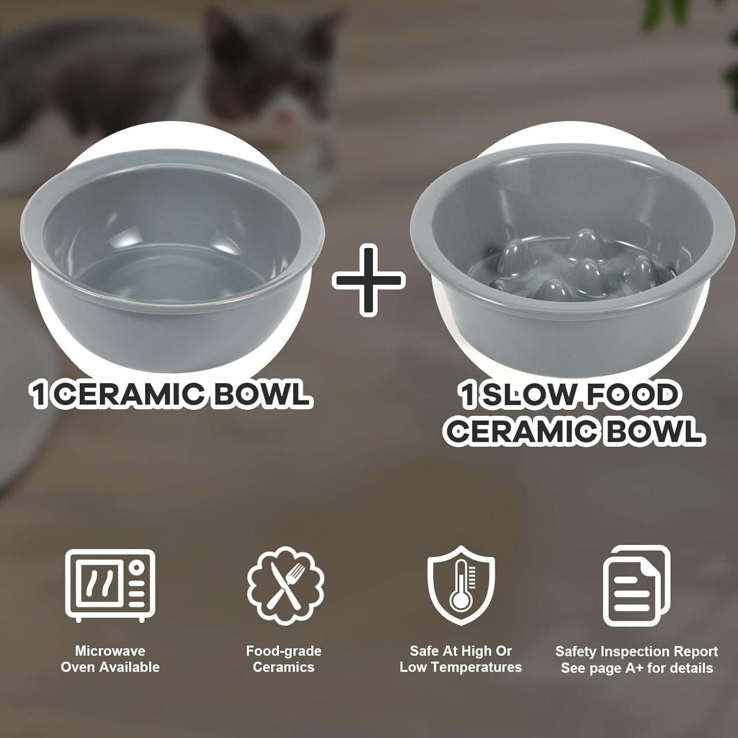 Upgraded Adjustable Height Cat Food Bowls Stand Ceramic Dog Bowls and Slow Feeder Cat Bowl, 15°Tilted Stand Anti Vomiting Raised for Small and Medium Sized Cats Dogs (Grey)