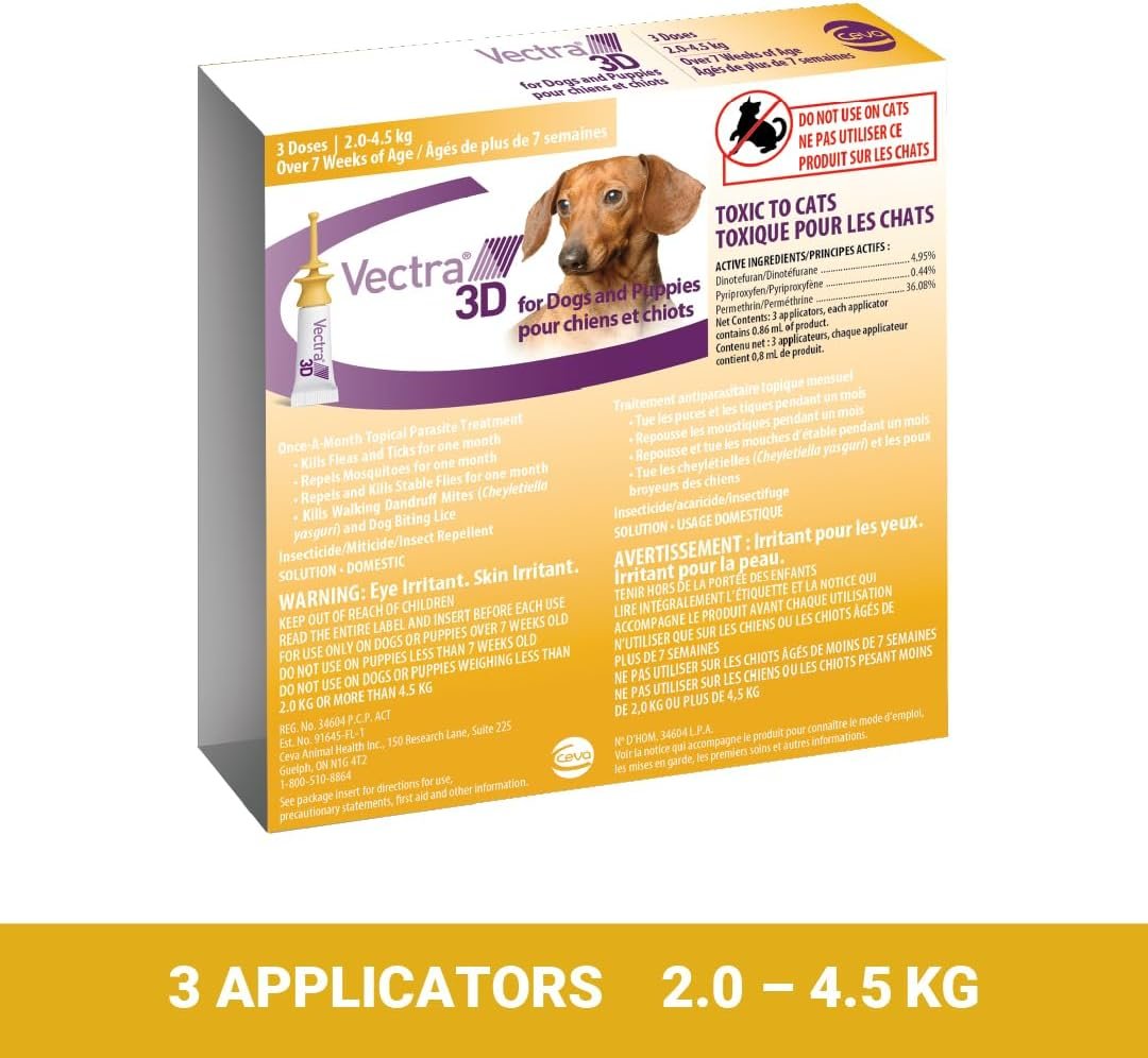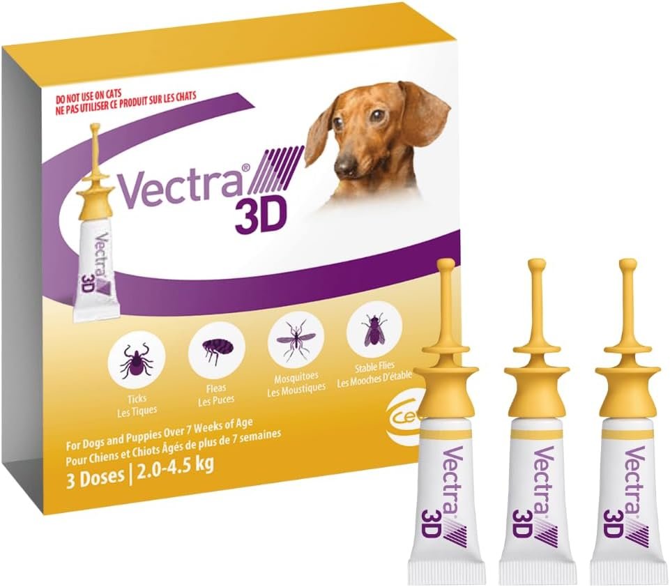 Vectra 3D Flea and Tick Treatment for Dogs and Puppies Weighing 2-4.5 kg (4.4-9.9 lbs) – Tick and Flea Prevention for Dogs That Repels Mosquitoes and More with Easy Monthly Application (3 Pack)