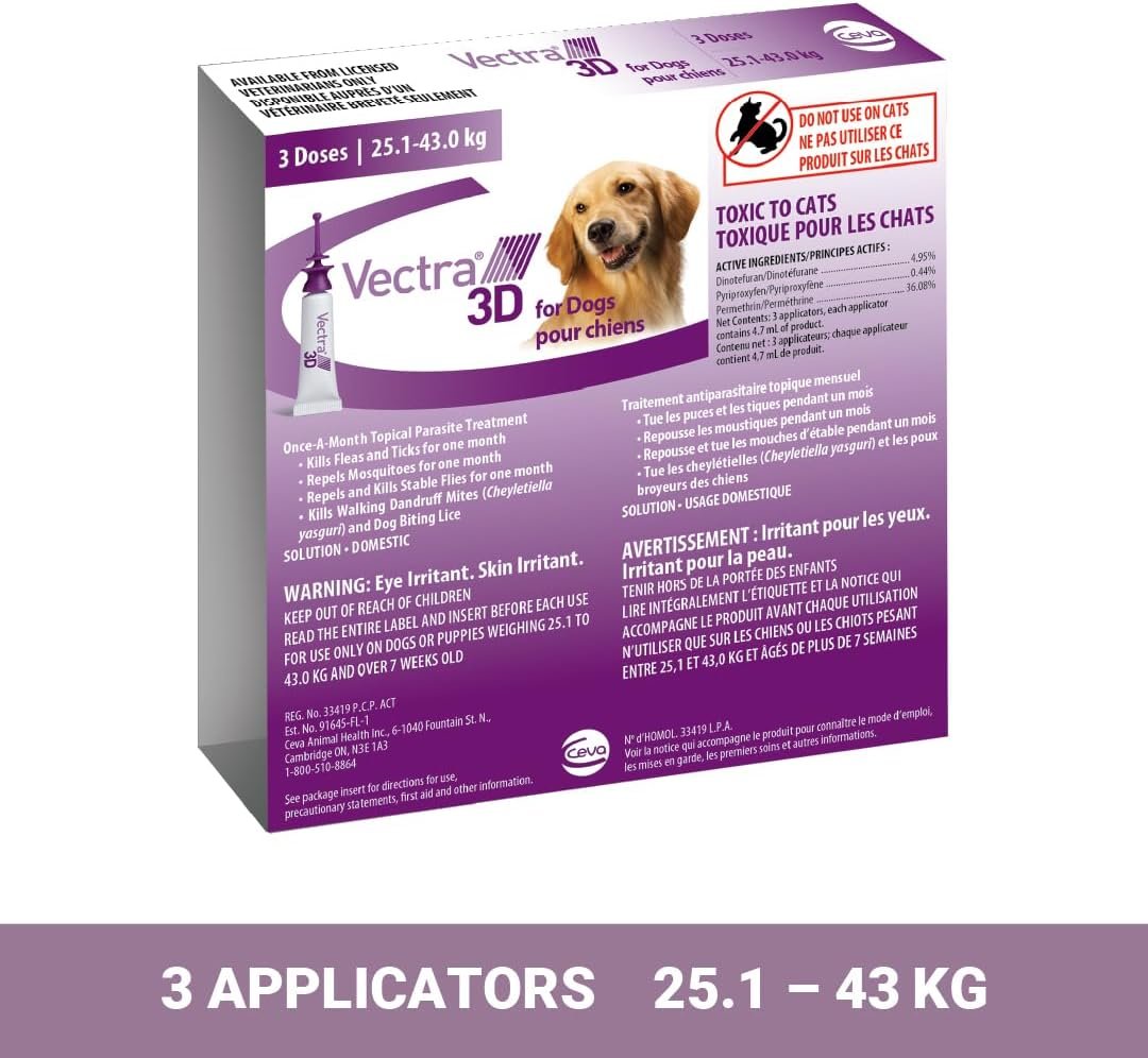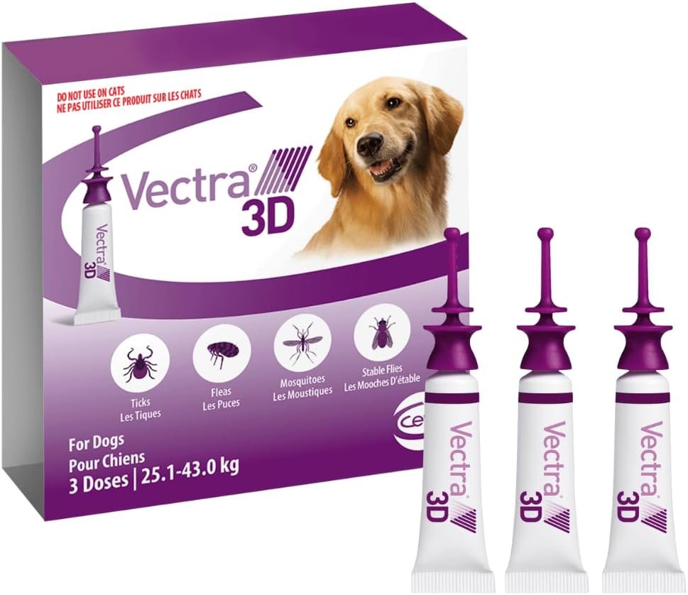 Vectra 3D Flea and Tick Treatment for Dogs Weighing 25.1-43 kg (55.2-94.6 lbs) – Tick and Flea Prevention for Dogs That Repels Mosquitoes and More with Easy Monthly Application (3 Pack)