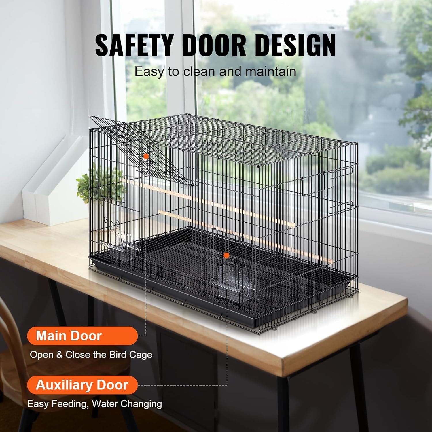 The main door has a safety design for caregiver access for feeding, cleaning, and maintenance, preventing bird escapes. An extra access door simplifies food and water replenishment.