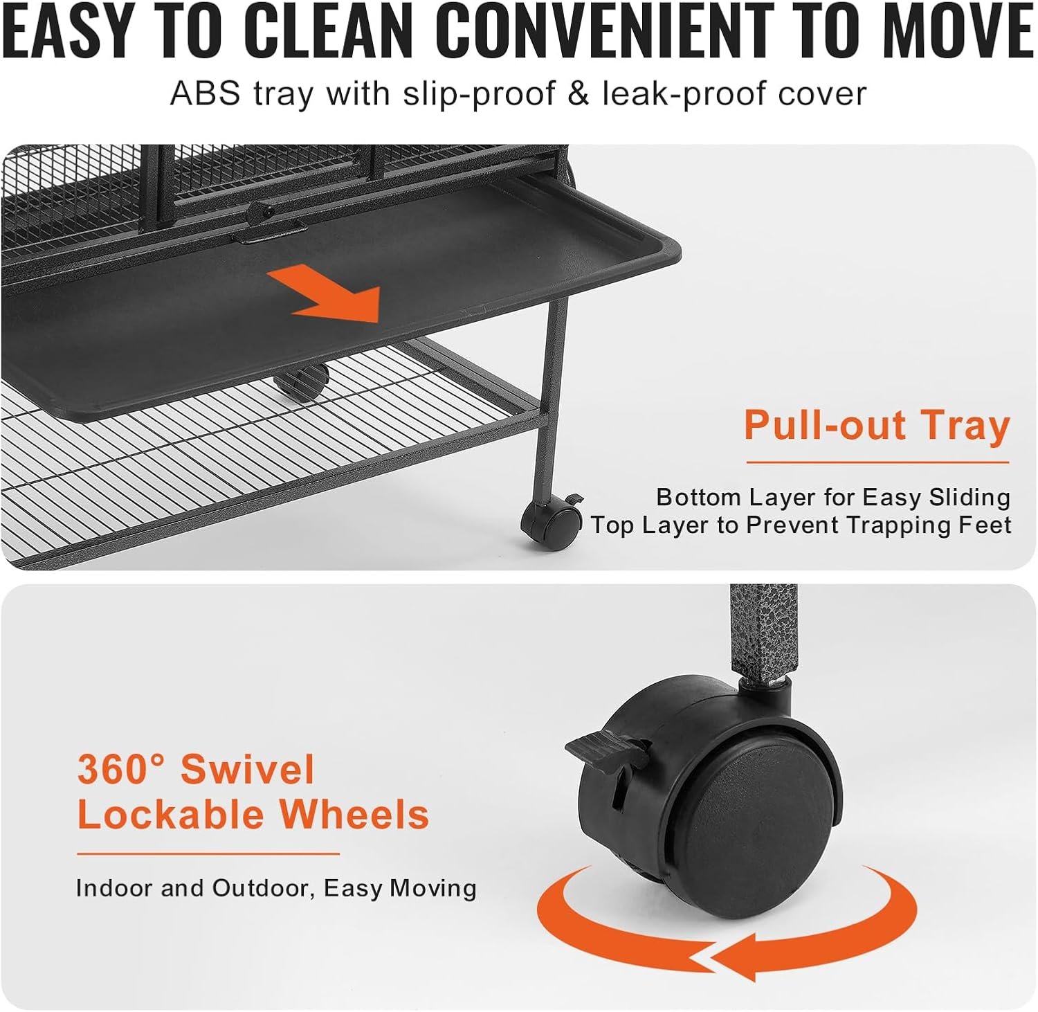 Easy to Move and Store: Our metal rolling pet cage comes with lockable rolling wheels, allowing easily move your pets from indoors to outdoors, letting them enjoy sunlight and nature. There is a spacious storage shelf, perfect for placing pet supplies. The shelf can be split into sections, offering more flexible storage options!