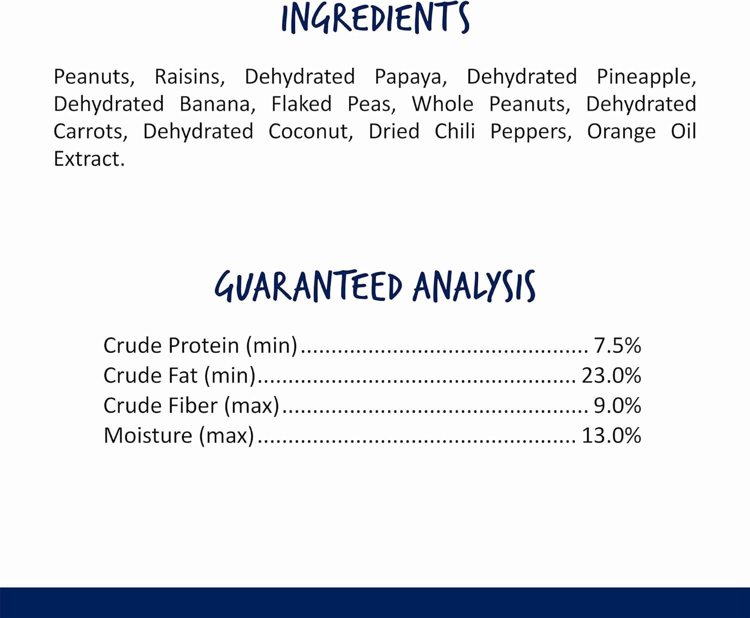 Treat your Cockatiel or Parrot to a super fruit cocktail bursting with bright, colorful banana, pineapple, papaya, raisins, coconut, peanuts, peas, carrots, red peppers, and more. Simply add to your bird’s regular food as a supplement, or offer Super Fruit Cocktail in a separate treat cup. Specially-formulated premium blend of sun-ripened fruit and delicious vegetables contains essential trace elements, vitamins and minerals, helping provide the necessary nutrients and variety your bird needs. Resealable 20oz bag retains freshness.