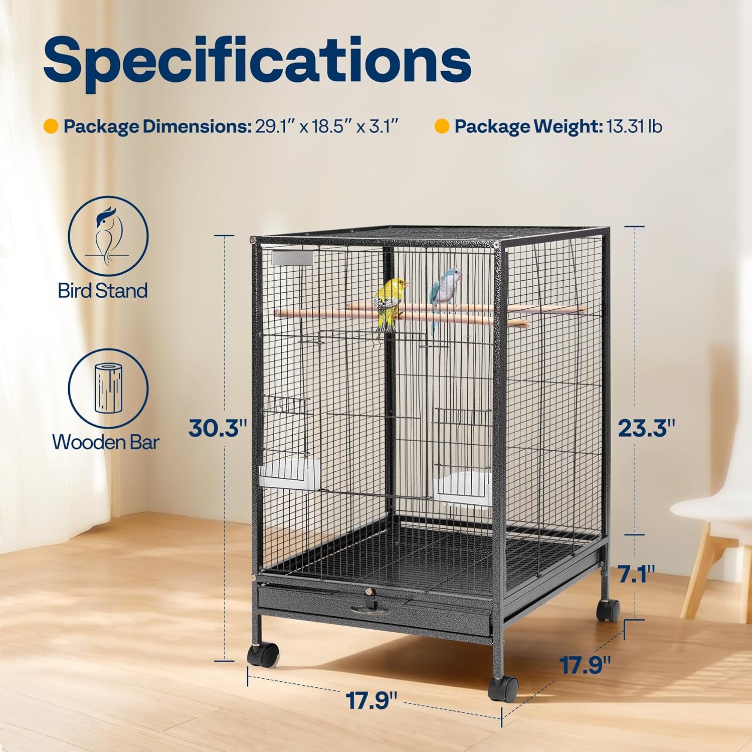 STURDY FRAME – This large bird cage is made of high-quality, low-carbon, rust-proof and waterproof steel, with guaranteed quality and durability; This cage is covered with non-toxic hammer-pattern paint, giving birds a healthier and safer living environment; The steel frame is more stable, with four caster wheels at the bottom, so you can move it anywhere you like, saving you effort; Cage has a perfect anti-escape design, and latch that is firm and safe