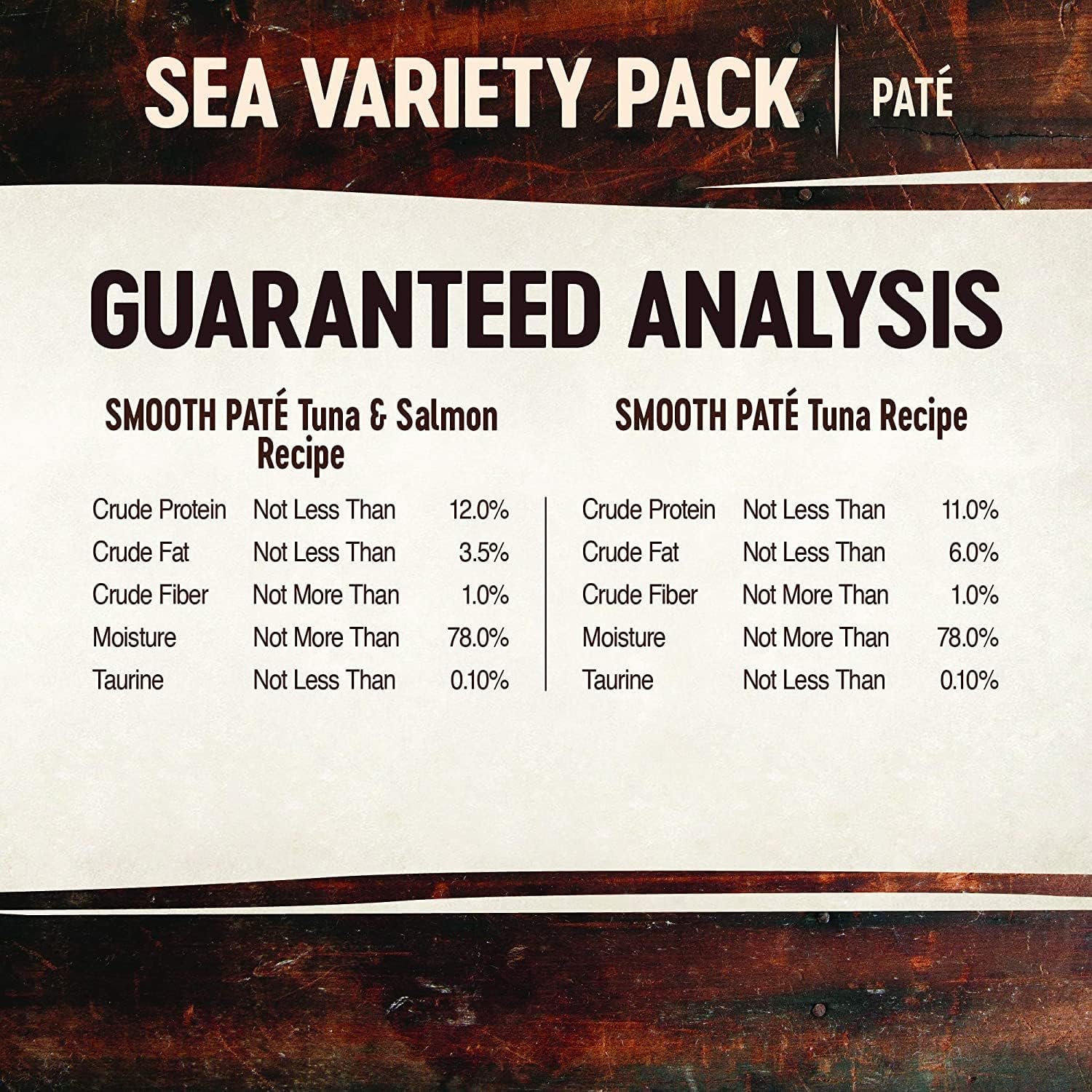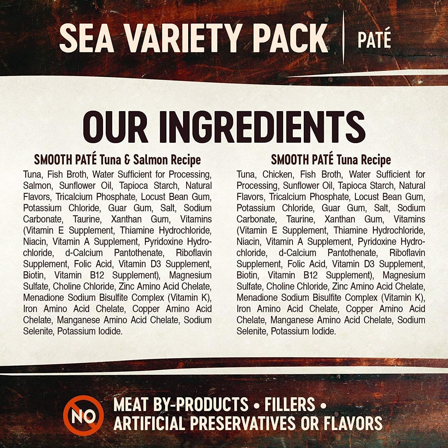 VARIETY PACK WITH TUNA PATE and TUNA and SALMON PATE: This natural, grain free cat food delivers the variety your cat craves, in a single serve pouch; an excellent source of rich quality proteins for a complete, balanced nutrition