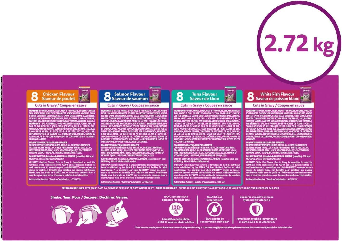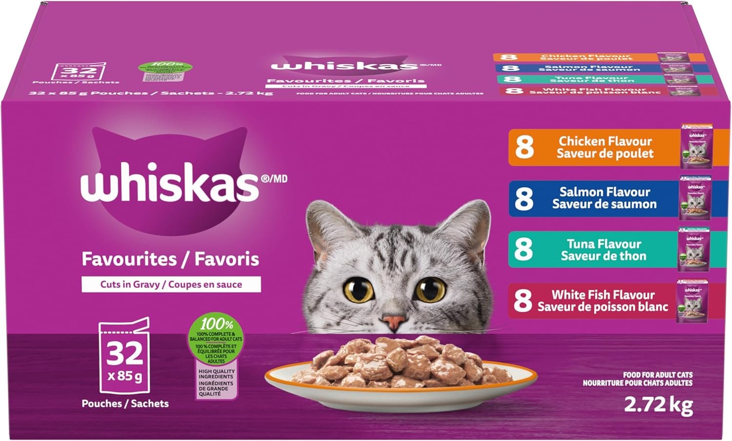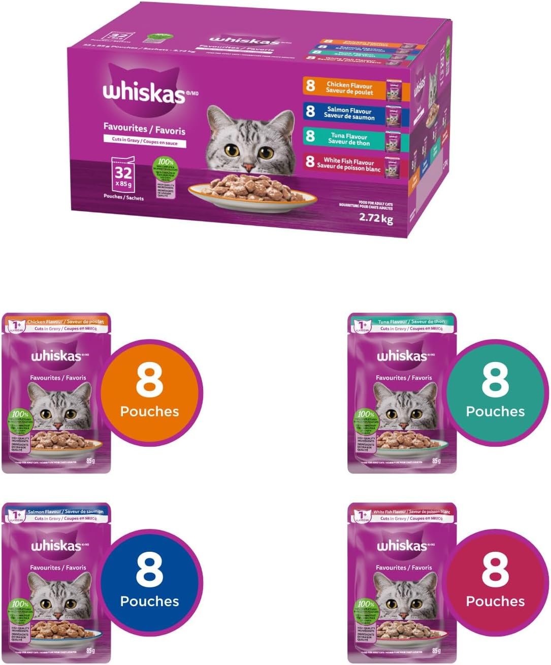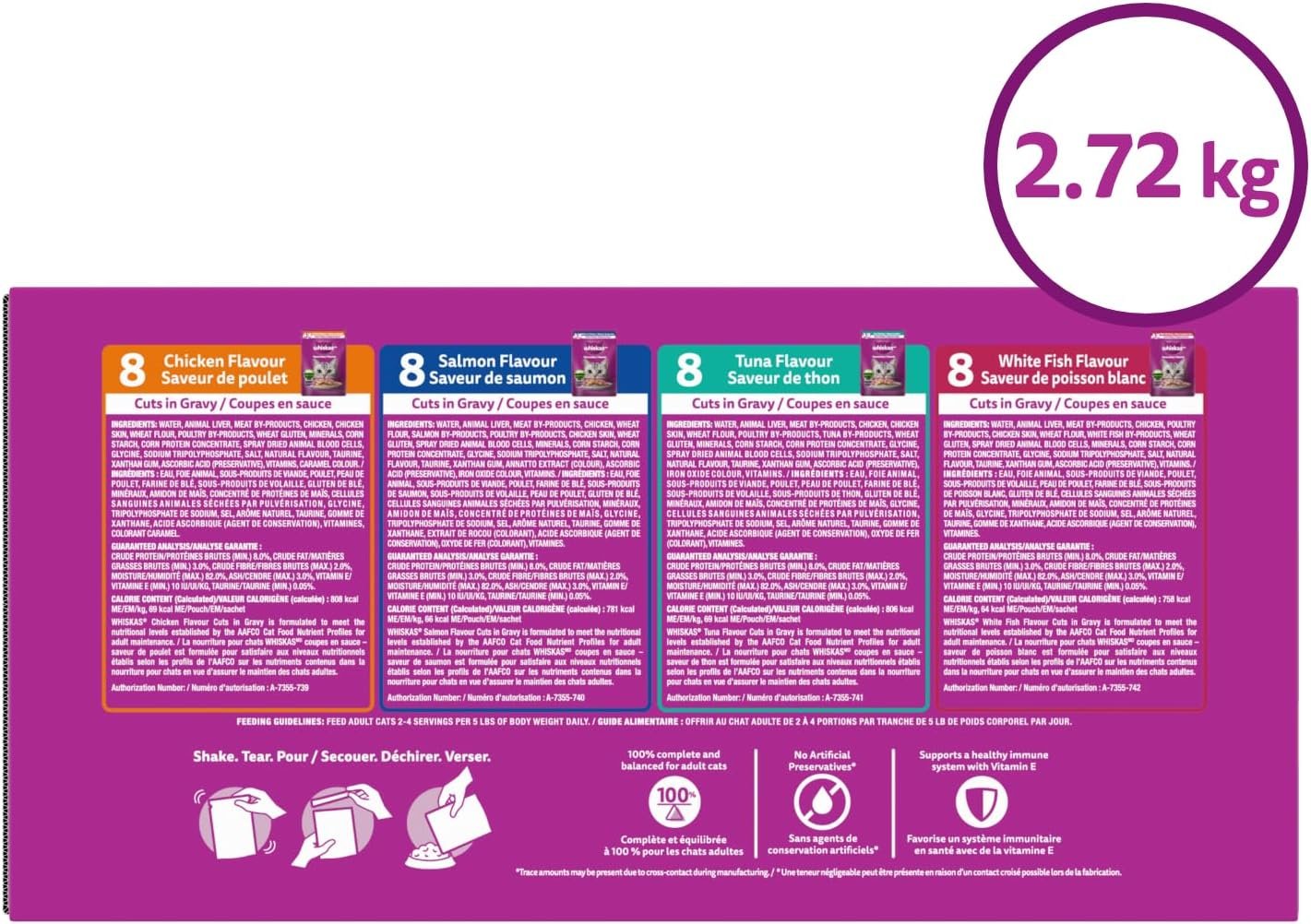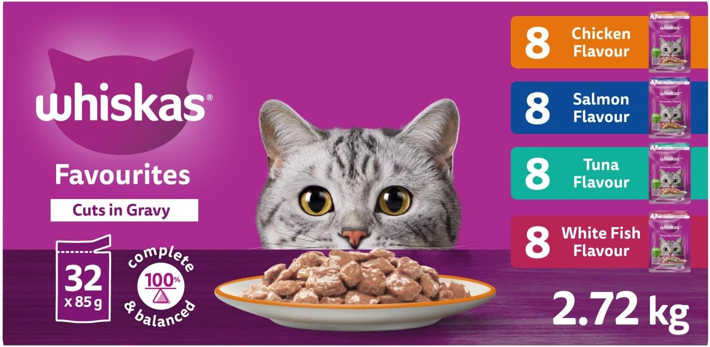 WHISKAS Favourites Adult Wet Cat Food – Chicken, Salmon, Tuna, White Fish Flavour Cuts in Gravy – 100% Complete and Balanced – Multipack 32x 85g Pouches