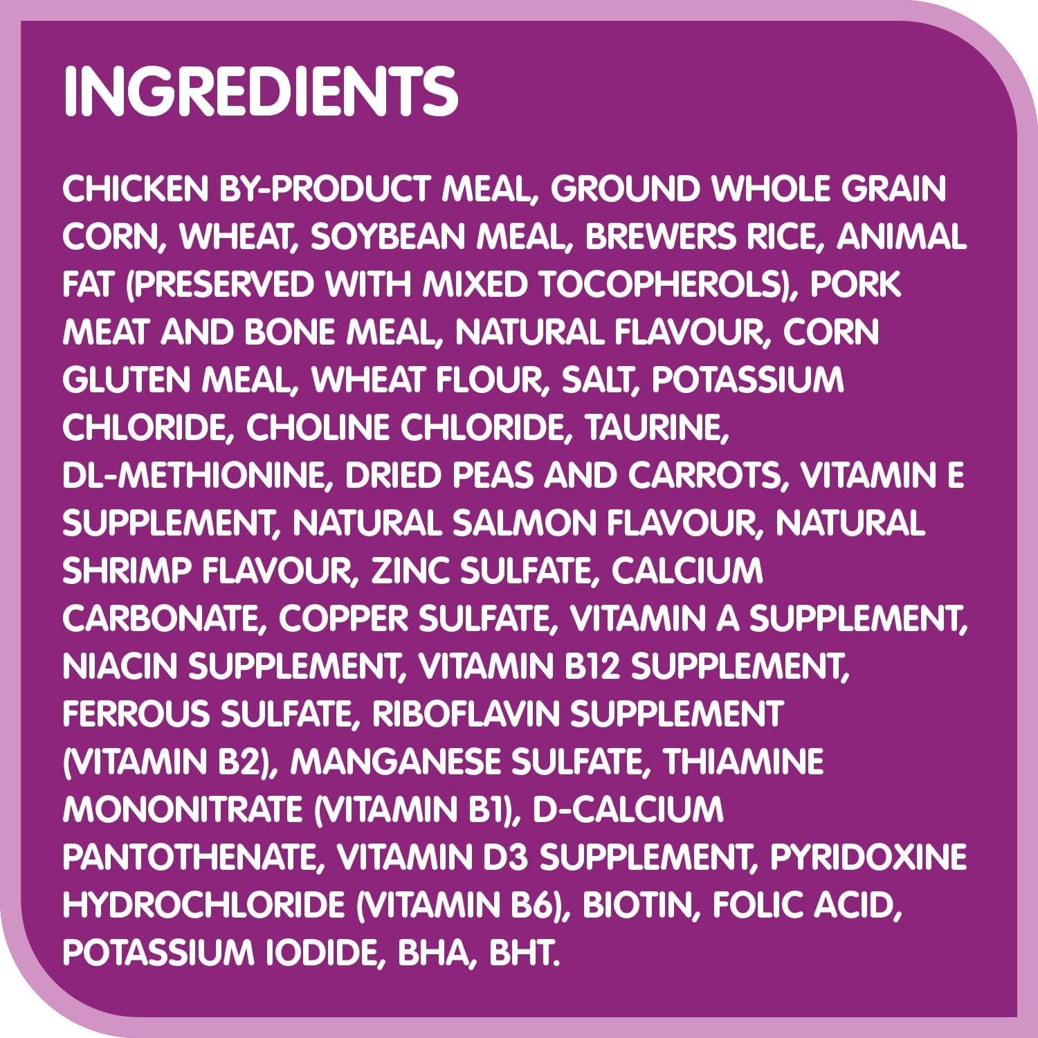 Cat parents love the independent spirit of their pets but know they still need loving care. That’s why all WHISKAS Dry Cat Food recipes are made with real high quality protein and real chicken, beef, seafood, or other natural flavours. WHISKAS provides a 100% nutritionally complete and balanced meal to keep your cat happy, vital, and full of life. WHISKAS Dry Cat Food for adult cats 1 year and older has a crunchy kibble outer layer, which helps support your cat’s oral care, and a tasty, soft, meaty centre. Together, they deliver high quality protein in an irresistible flavour cats love. Made with no artificial flavours or colours, WHISKAS Dry Cat Food Seafood Selections Natural Salmon & Shrimp is made with real salmon and natural shrimp flavour. Conveniently, WHISKAS Dry Cat Food does not require refrigeration after opening and can be left out in a bowl all day without the risk of drying out or going stale. This makes it easy to travel with, too. As the makers of WHISKAS we recommend that two thirds of your cat’s daily calories come from wet cat food and one third from dry cat food, so try mixing it up at mealtime by alternating WHISKAS Dry Cat Food with WHISKAS Wet Cat Food. It’s a good way to keep your cat interested and happy for 100% more purrs!