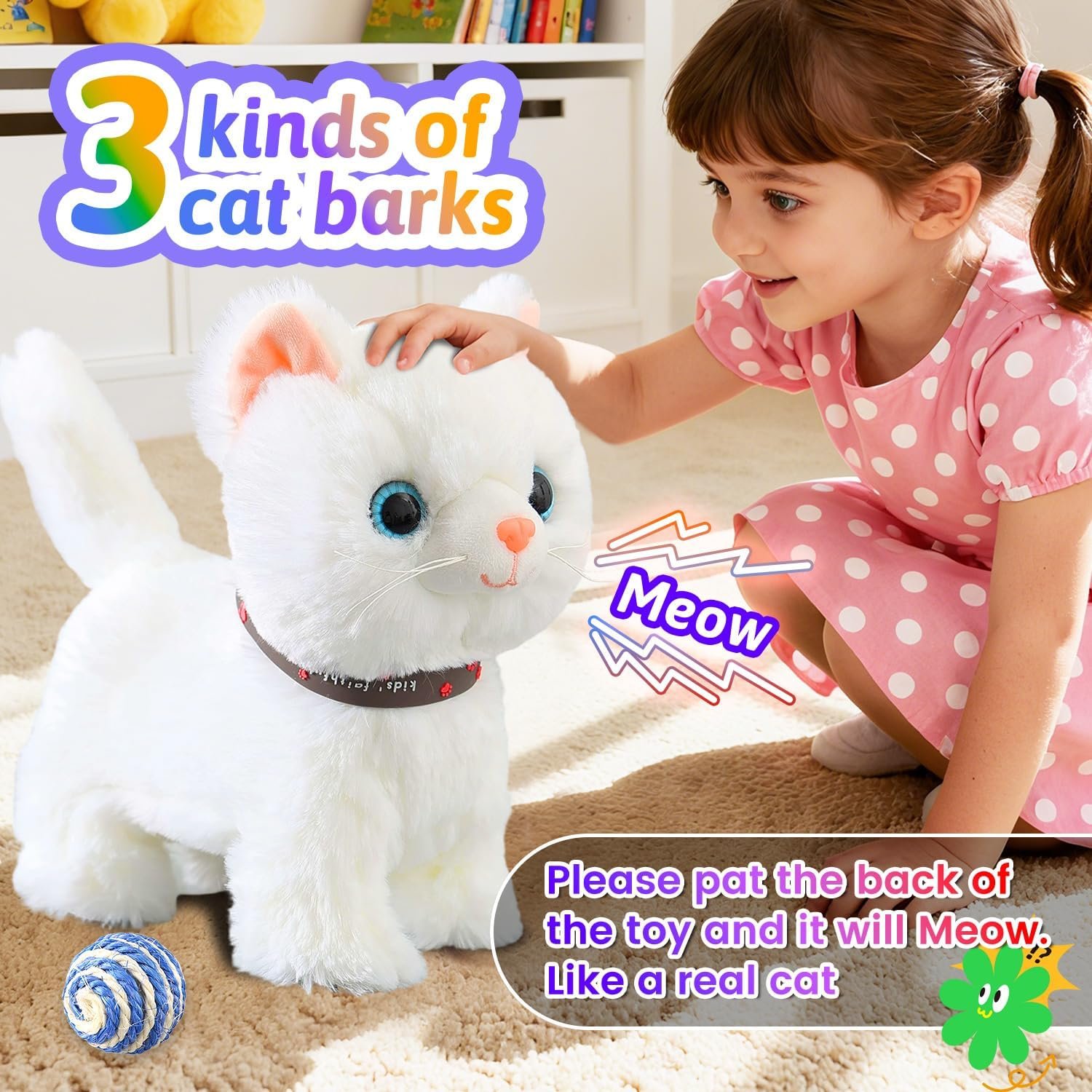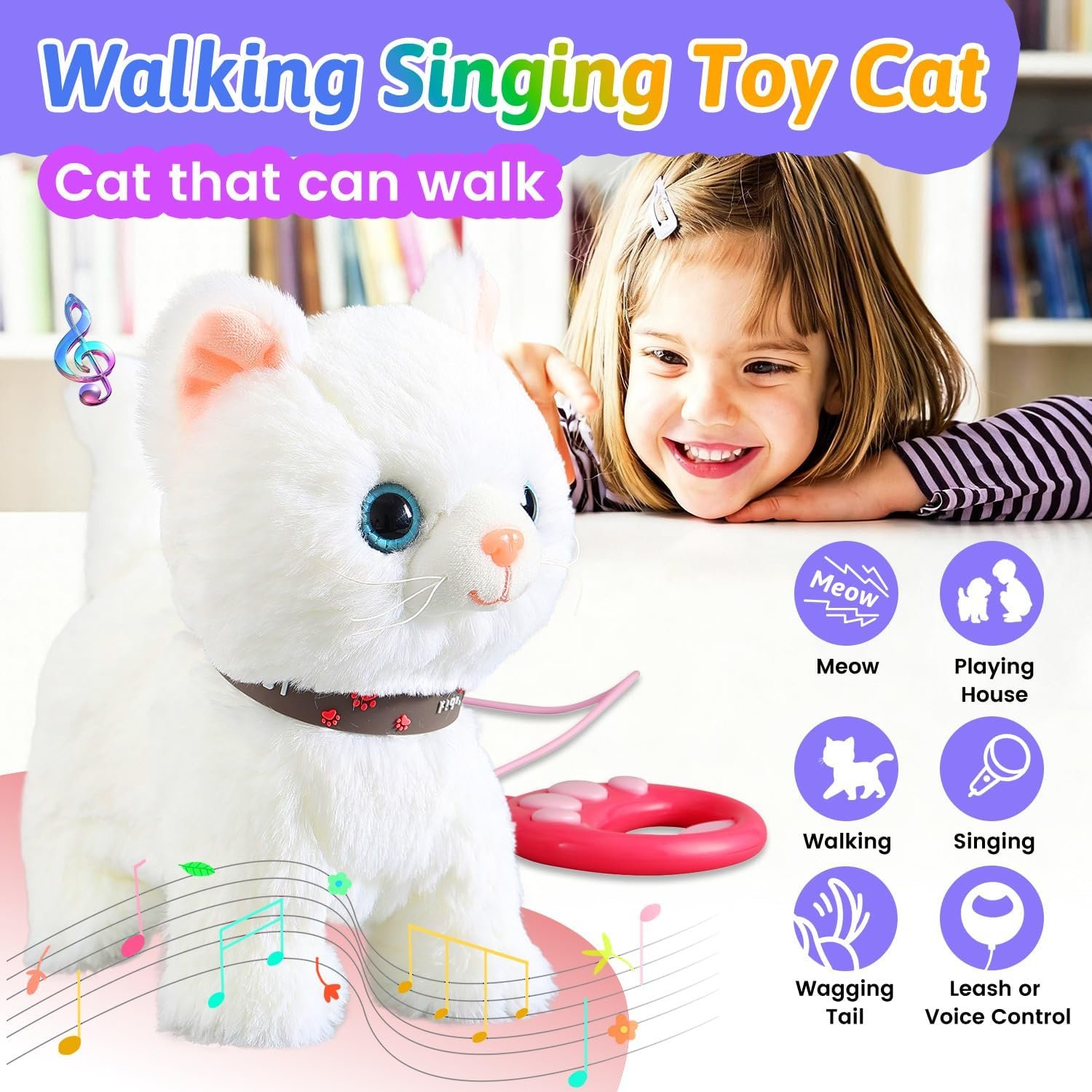Walking, Singing, Meow: the cat toys can act as real cat, active your cat by just pressing the button on the remote control leash, it can walk, sing, meow, and wag its tail, Each time you press the switch, it switches to a song,suitable for children of all ages
