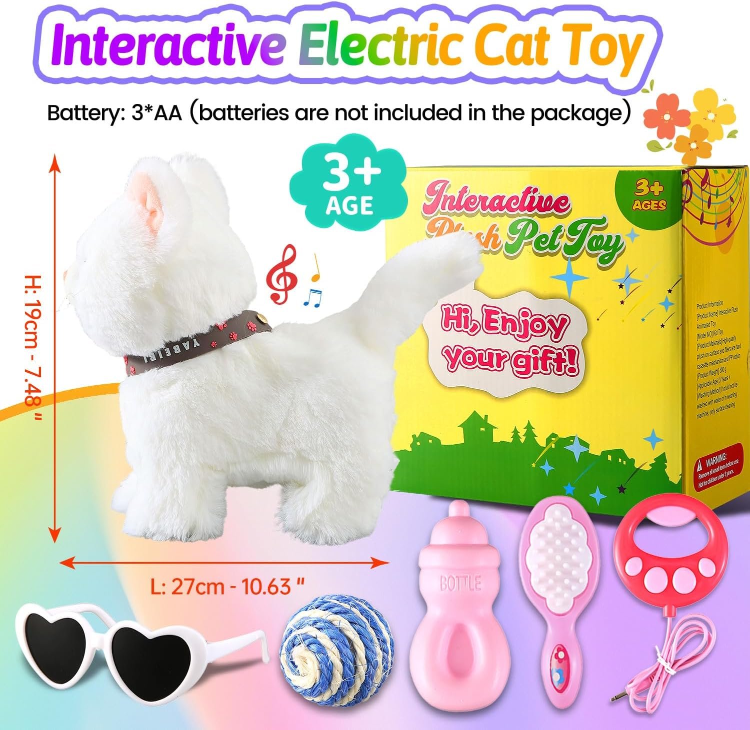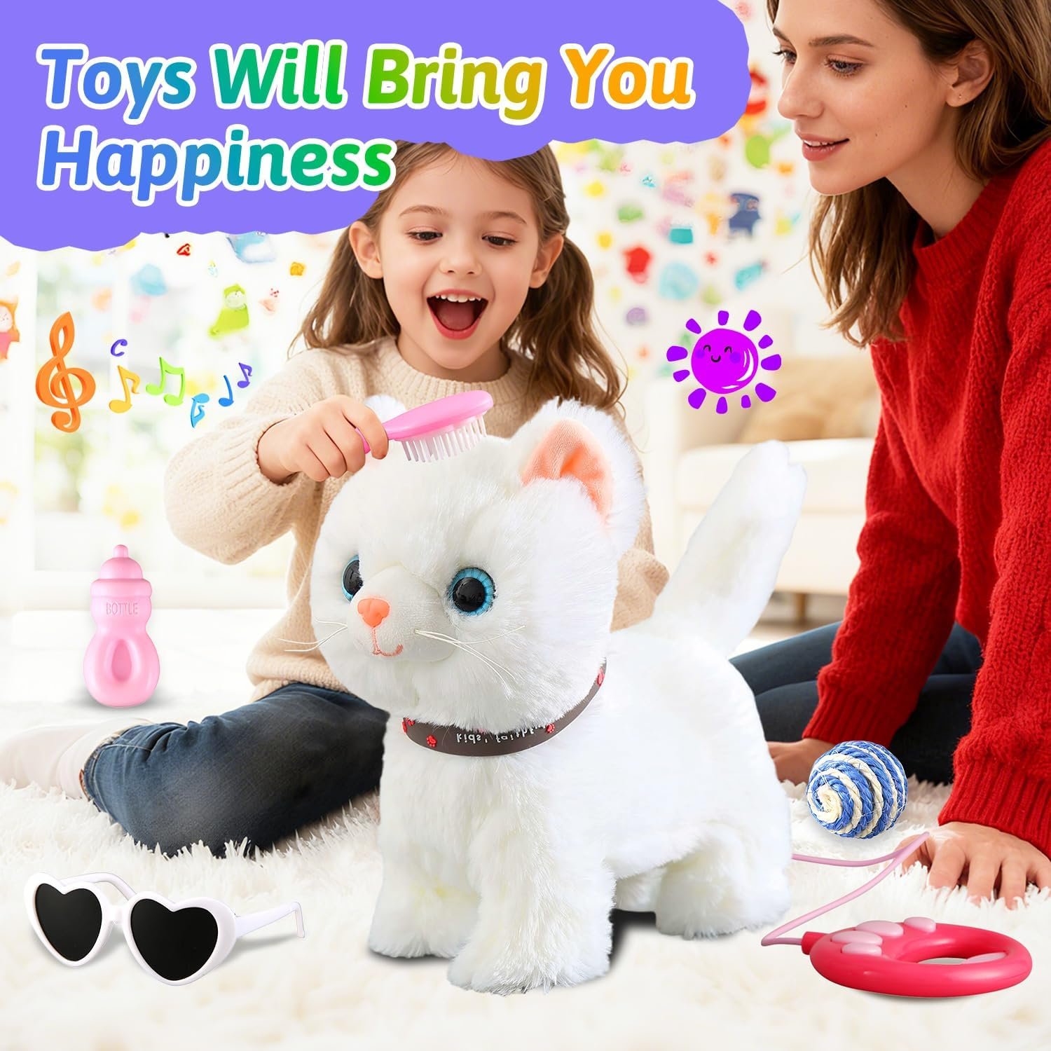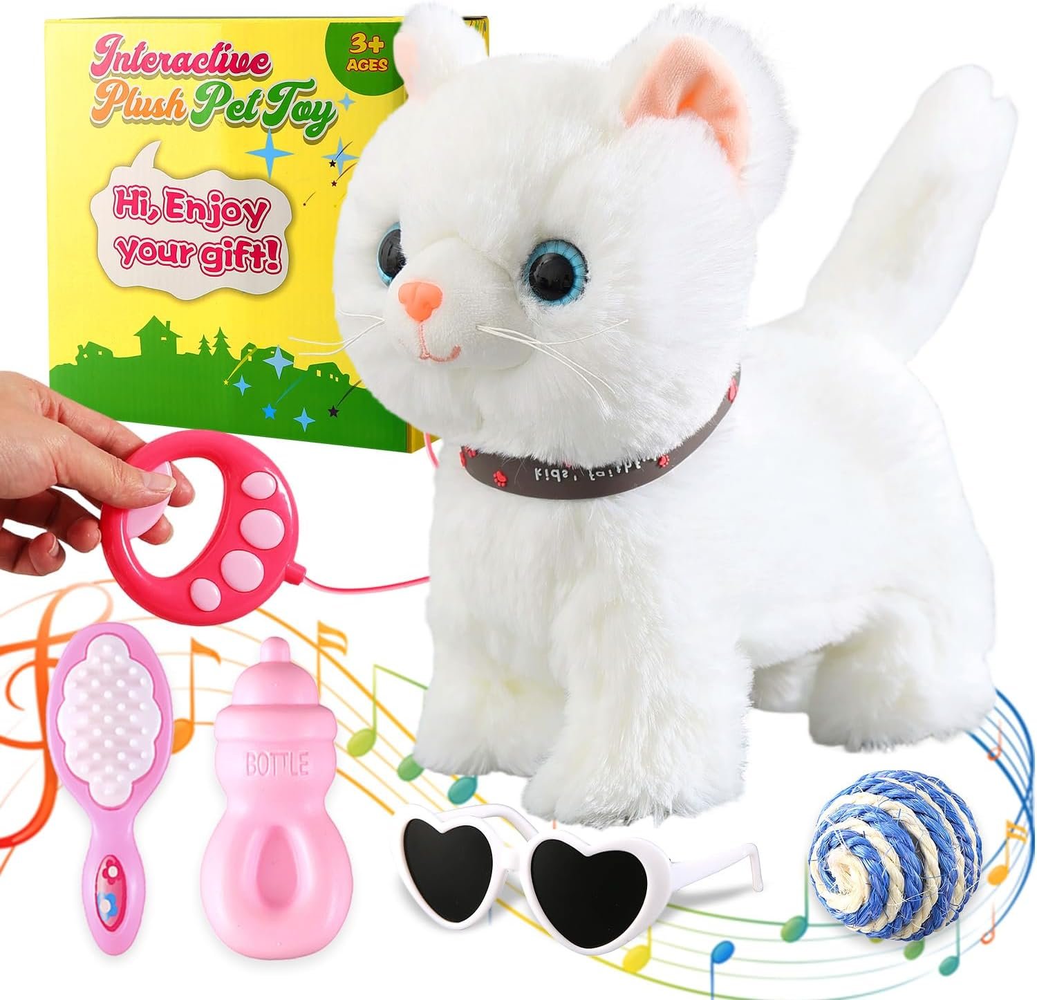 Walking Toy Cat*1, Detachable Leash*1, Toy Bottle*1, Toy Comb*1, Toy Ball*1, Toy Sunglasses*1, Instruction Manual*1