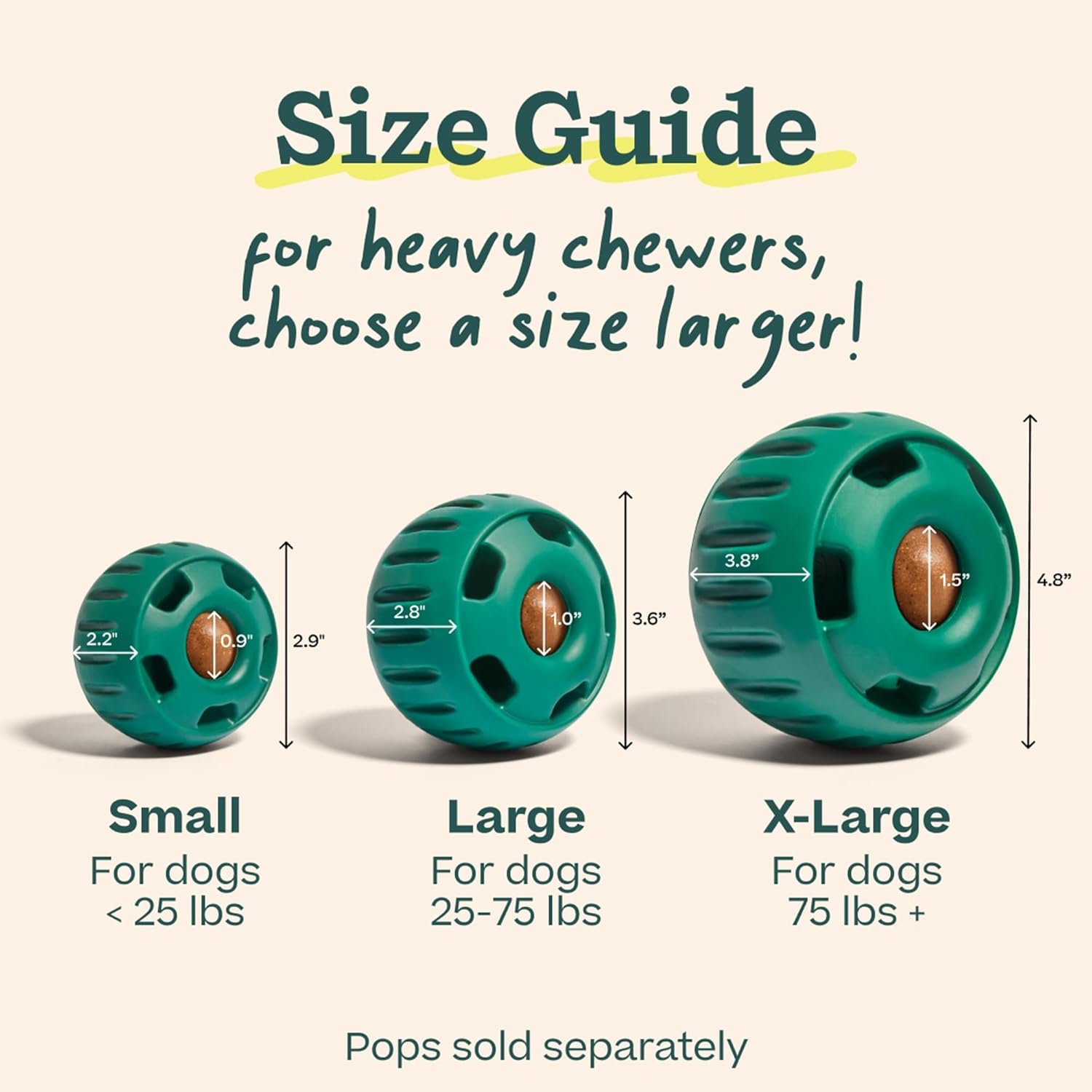 Our X-Large size is 4.78″ in diameter and 3.8″ tall. Our large Pupsicle is 3.6″ in diameter and 2.8″ tall and our small Pupsicle is 2.9″ in diameter and 2.2″ tall.
