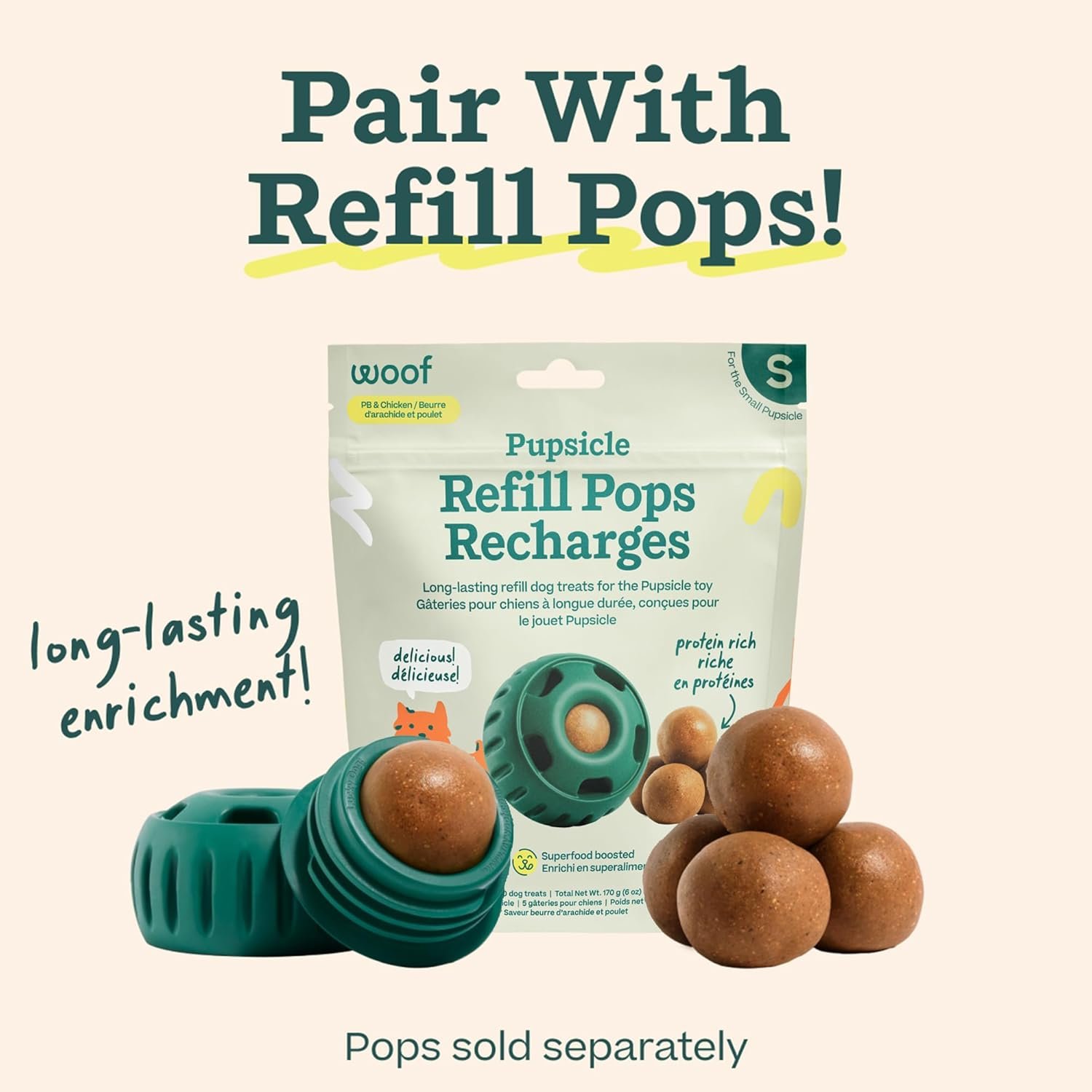 Depending on the treat and how focused your dog is, Pupsicle treats will typically last 30+ minutes. You can extend this by mixing treats into your frozen treats or by using Woof’s extra long-lasting Pupsicle Pops!
