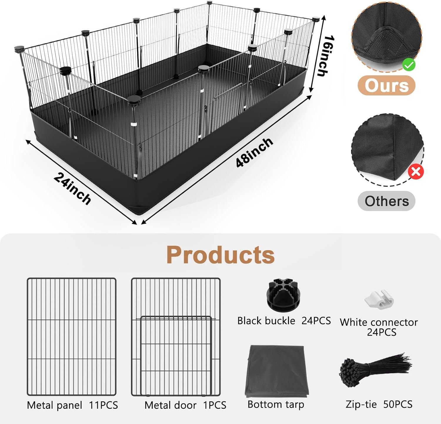 Triple Reinforcement to Prevent Loosening: Black buckles, white buckles, and black straps are all used to connect each panel. Different accessories provide stability from the bottom to the top of the guinea pig enclosure. The installation method is very simple, a 5-year-old kid can operate it (with instructions included). 50 black straps can be reused in areas you think need reinforcement.