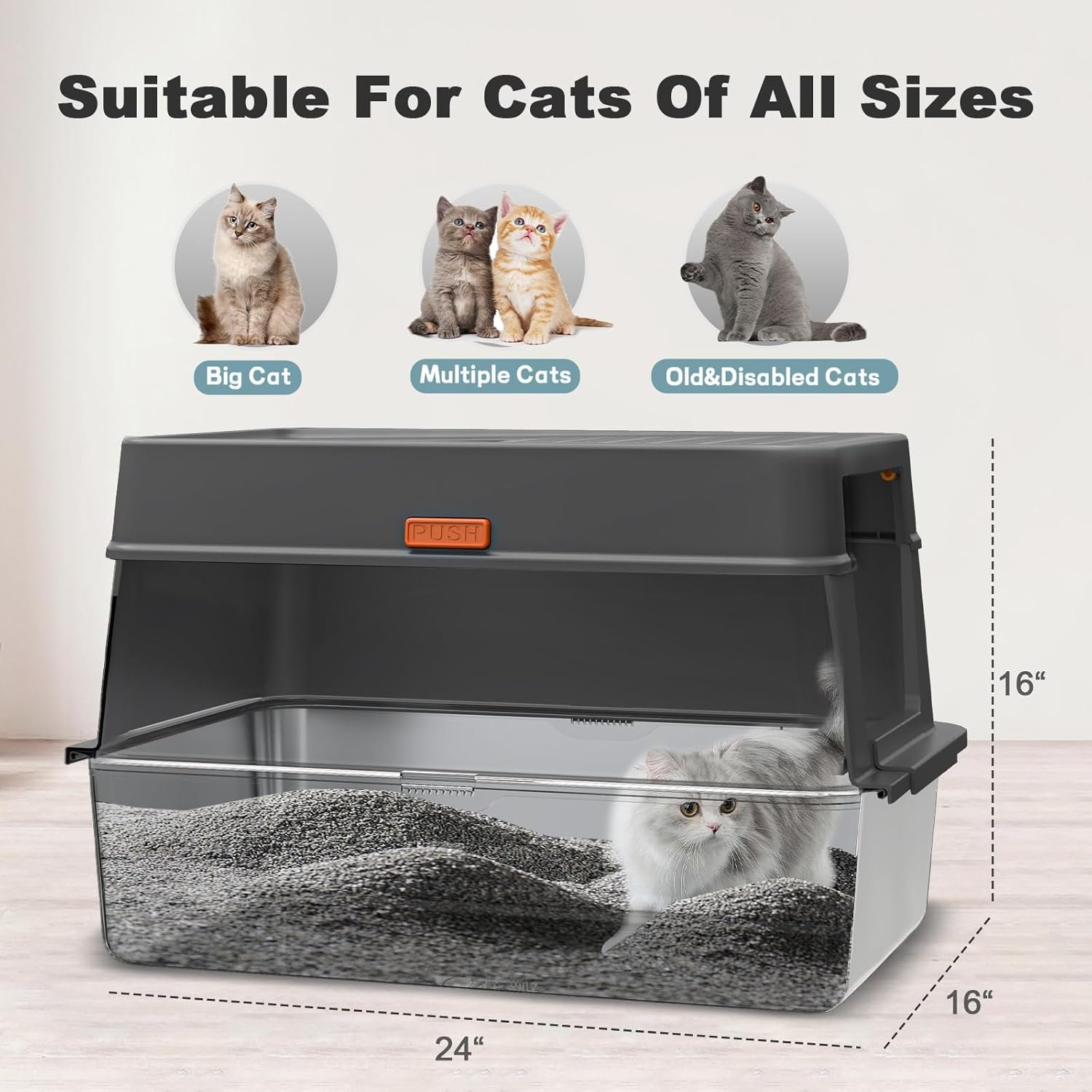 【Extra Large Litter Box for Big Cats】 The XXXL stainless steel cat litter box measures Length 24″, Width 16″, and Height 16″, Great for large cats, and provides ample space for most cats to dig.
