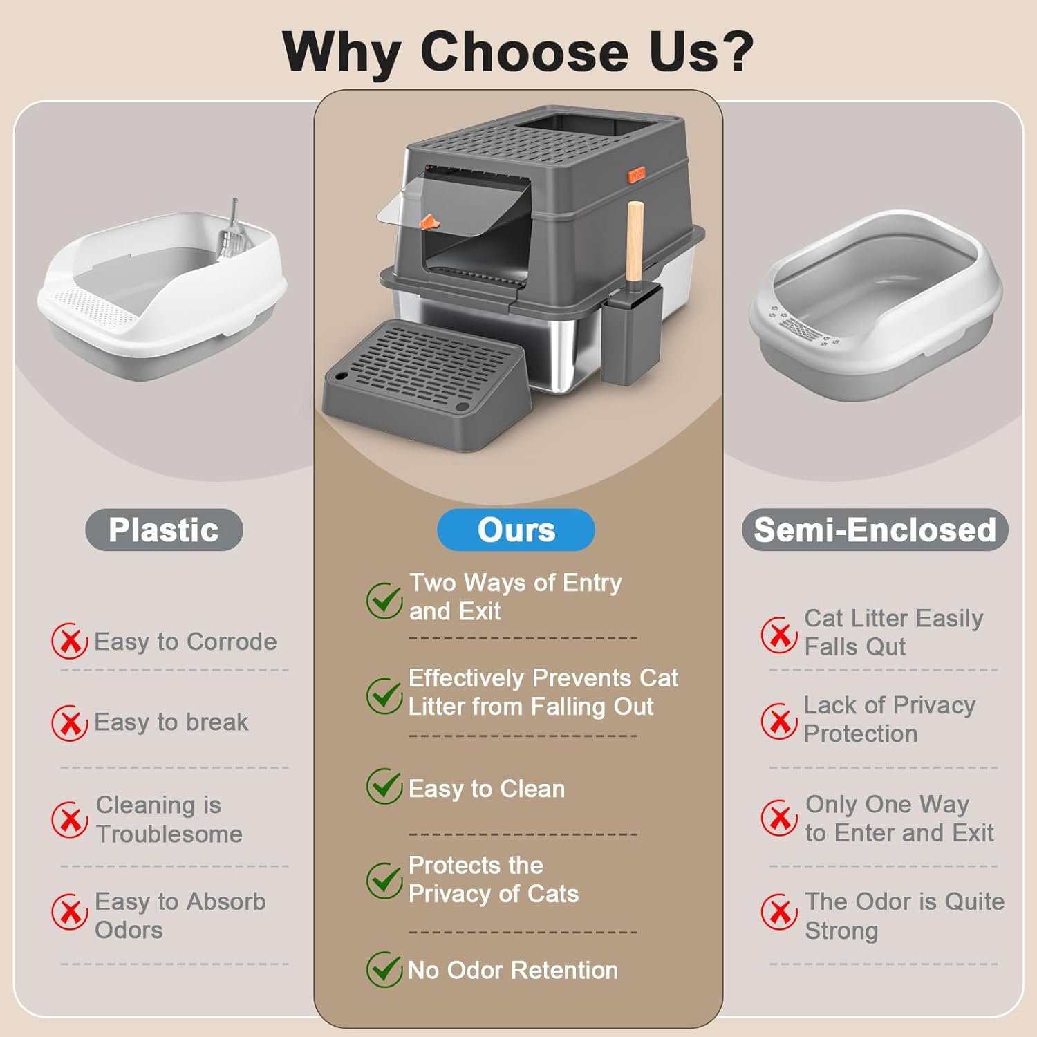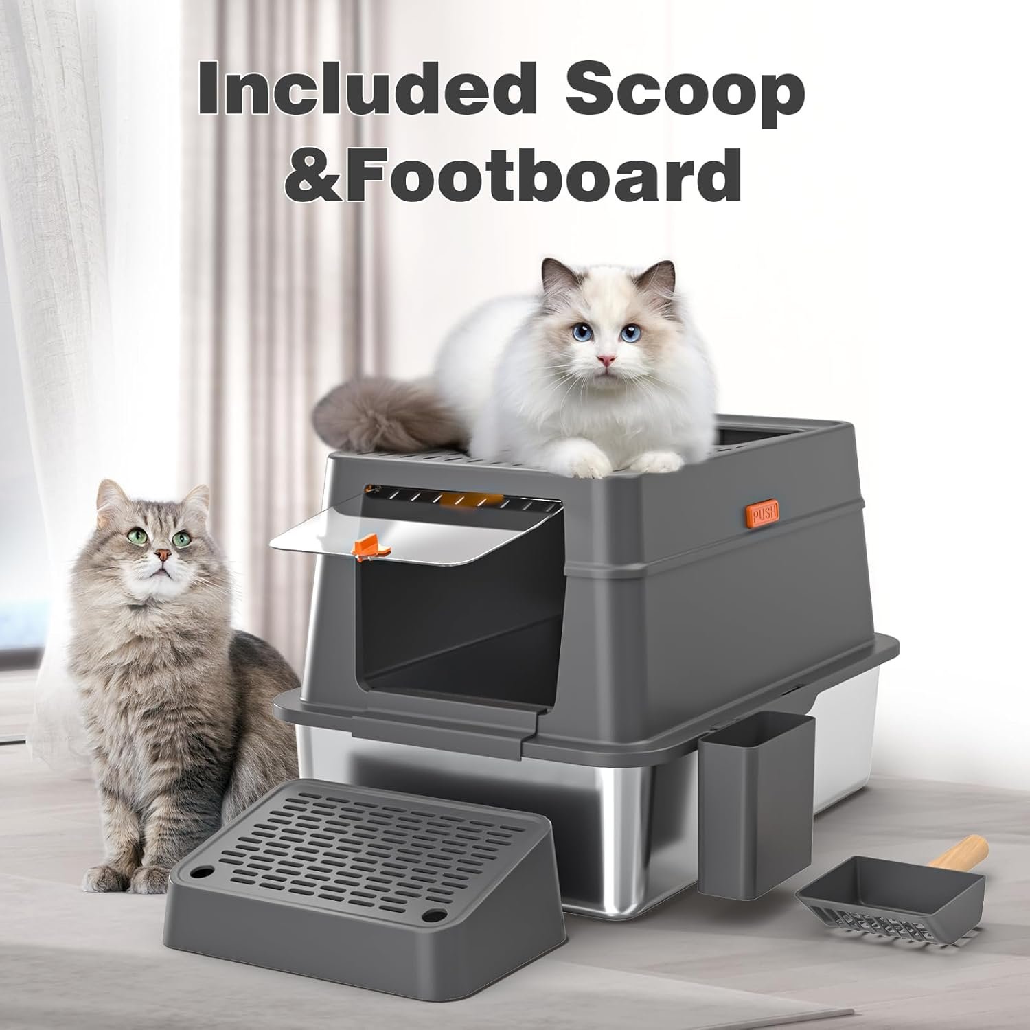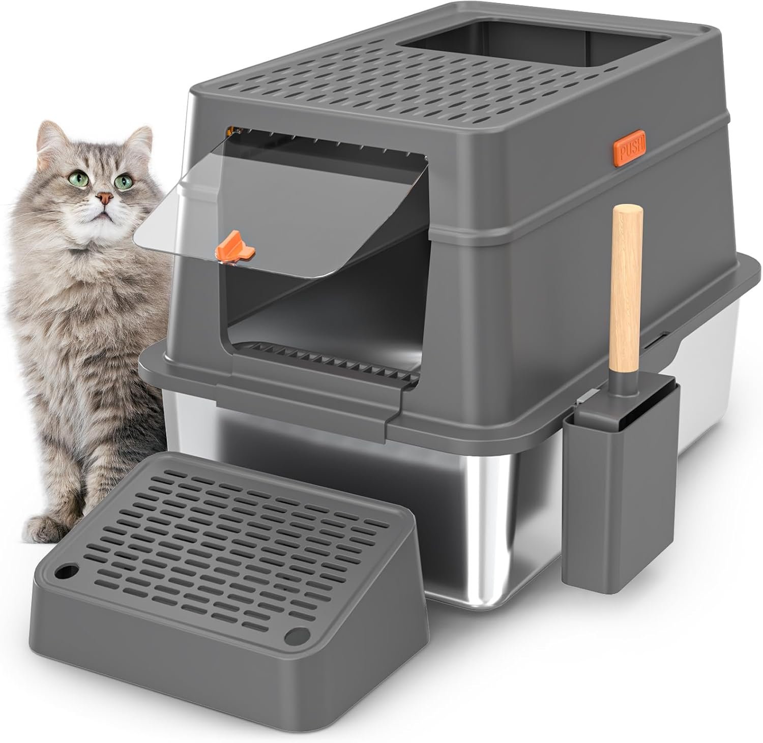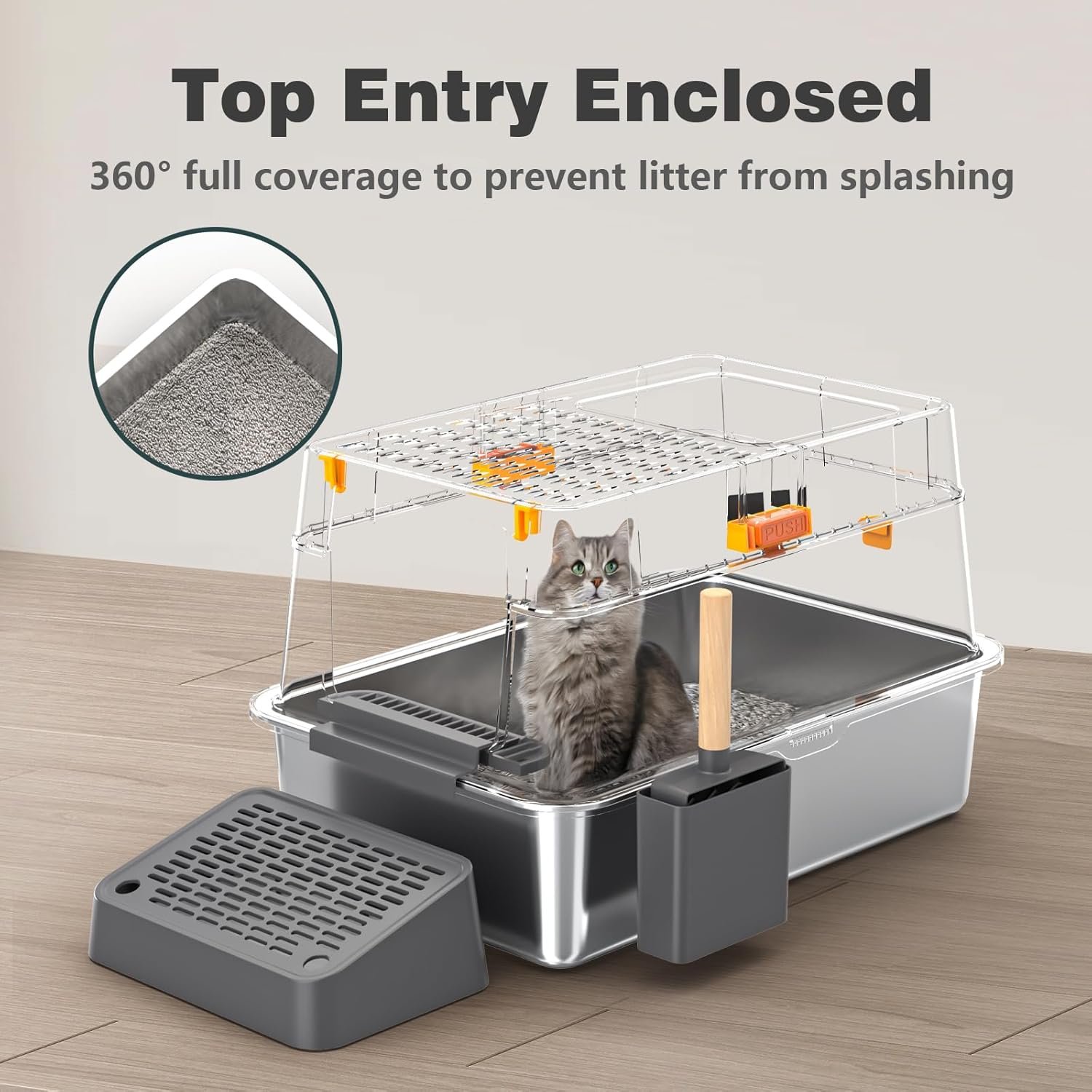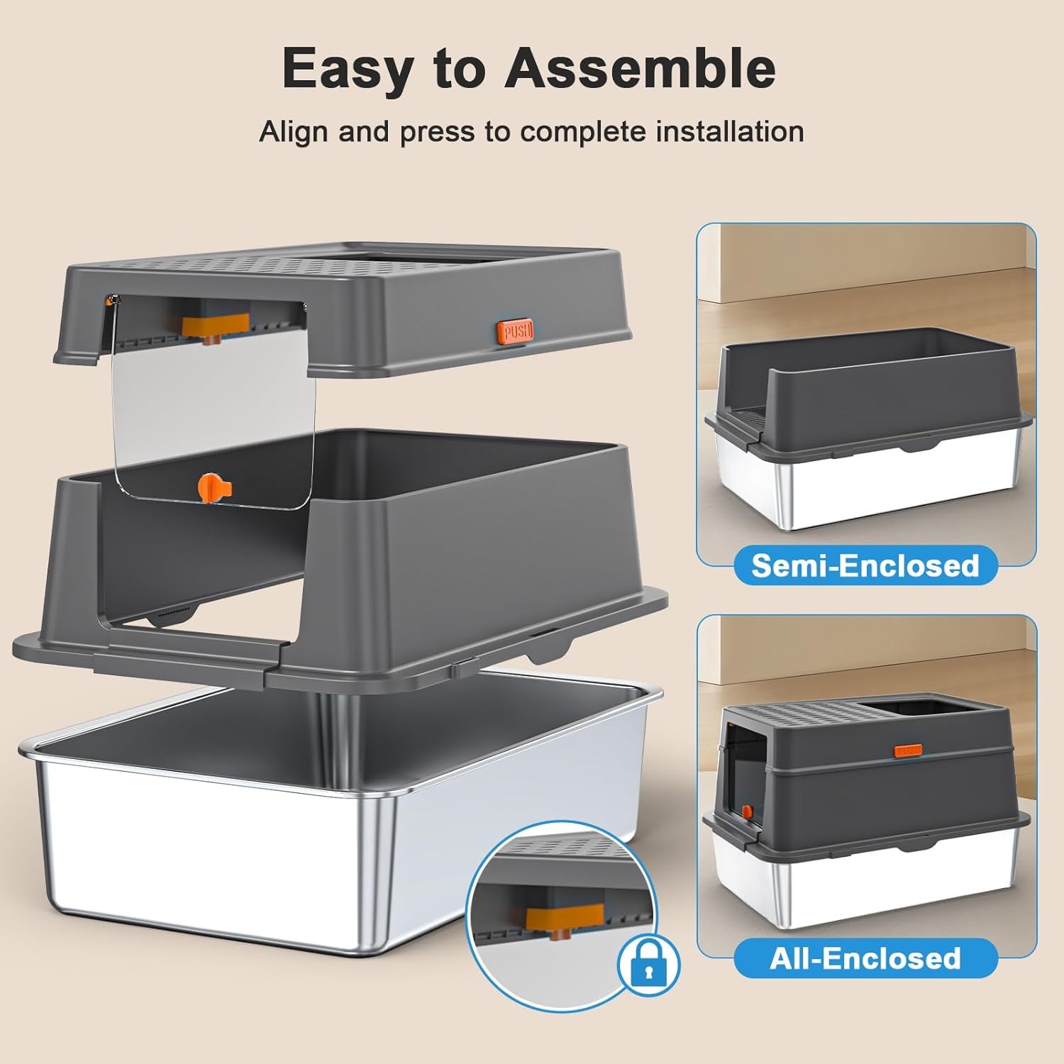 【UPGRADED BUCKLE DESIGN】The upgraded XXL stainless steel Large cat litter box with high sided adopts buckle installation, designed to securely secure the outer enclosure and stainless steel litter box.