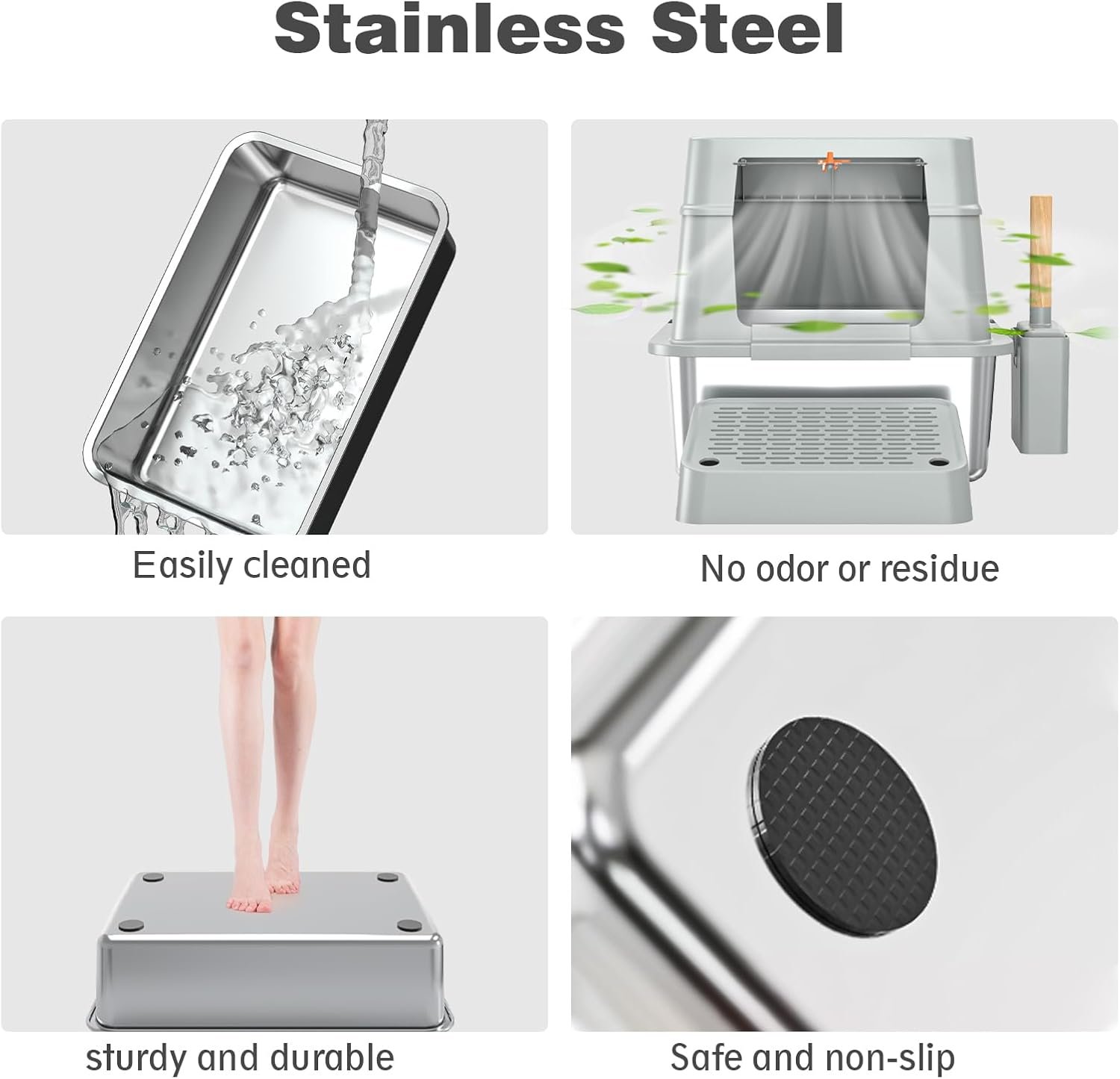 【Why Choose Stainless Steel Litter Box】 The open top large stainless steel litter box for big cats consists of a sturdy enclosed 6inches high sides enclosure and stainless steel litter pan. Unlike plastic cat litter boxes, stainless steel metal cat litter box never rusty, won’t be scratched and collect any residue or odor, non-stick pad, are easily to clean, have strong and durable.