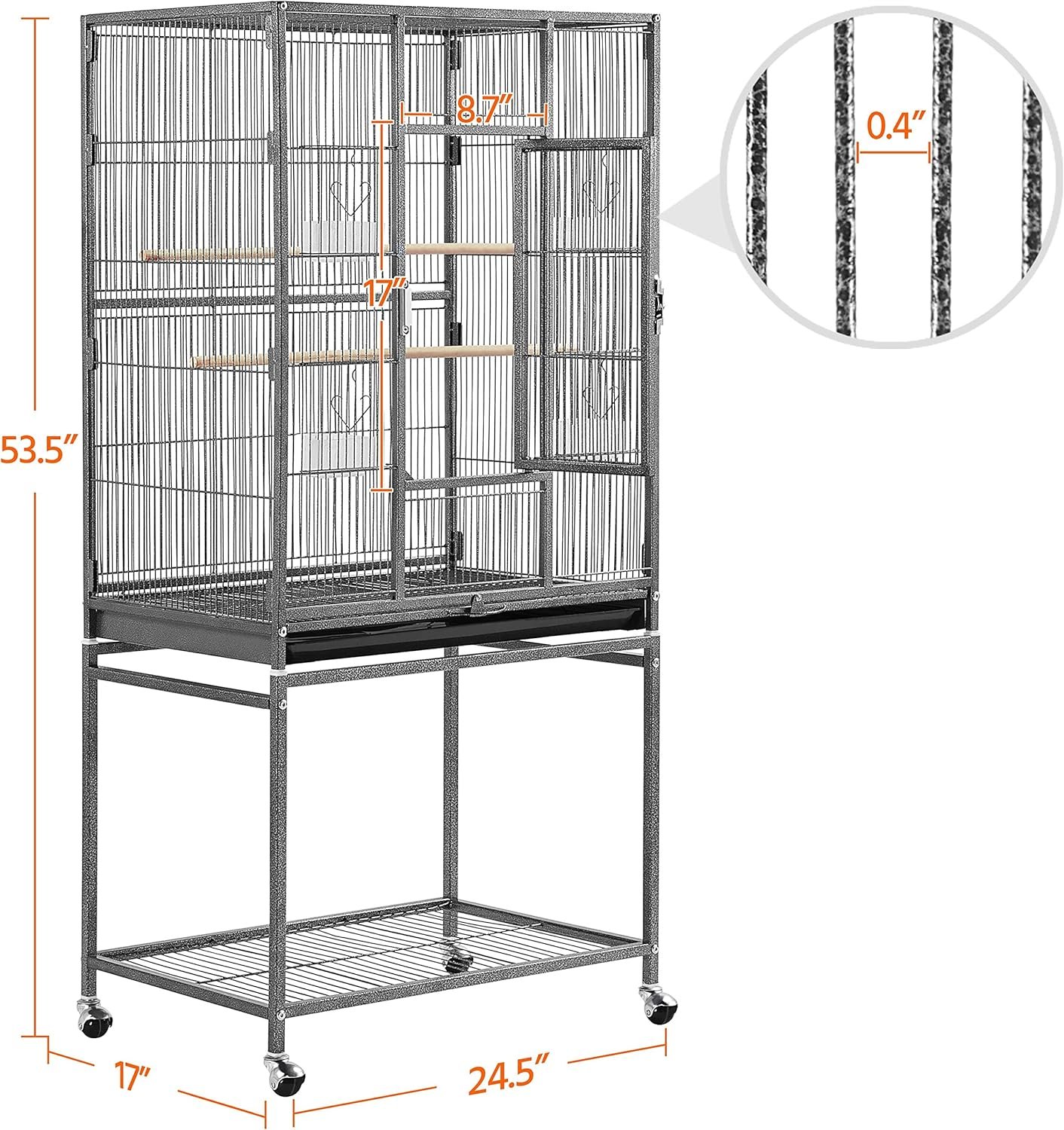 Pet-parent friendly designs: The cage features an extra storage shelf on the stand to keep pets’ accessories and feed handy and neat. Four feeder doors on the wall allow for convenient feed refilling. You can access the feeders from outside without scaring your bird.